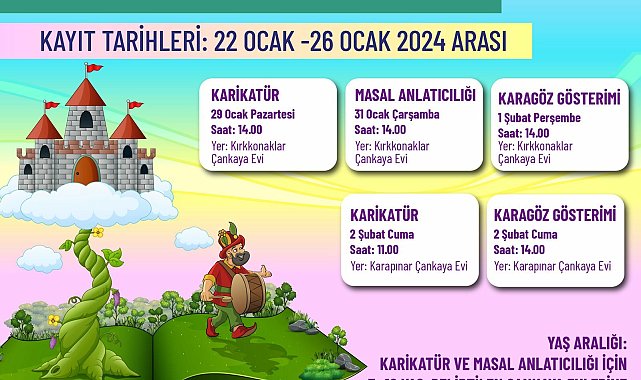 Çankaya Belediyesi, 2023-2024 eğitim öğretim yılının ilk yarısını tamamlayan öğrencilere tatili boyunca sanat ve eğlence dolu bir program sunuyor. “Tatilde Şenlik Var” etkinlikleri kapsamında tiyatro, film, pandomim gösterileri kültür sanat merkezlerinde, 7 -10 yaş arası çocuklara atölyeler de Çankaya Evleri'nde düzenlenecek.Çankaya Belediyesi 23 Ocak-2 Şubat arasında kültür merkezlerinde çocuklara yönelik etkinlikler düzenledi. Çocuklar için film ve tiyatro gösterileri ile oyun-etkinlik atölyeleri, Yaşar Kemal Kültür Merkezi, Yılmaz Güney Sahnesi, Doğan Taşdelen Çağdaş Sanatlar Merkezi ve Çankaya Evleri'nde öğrencilerle buluşuyor. 3 yaş ve üzeri çocuklar, kültür sanat merkezlerinde düzenlenen film, tiyatro, pandomim gösterileri tamamen ücretsiz olacak.ATÖLYELERE SON BAŞVURU TARİHİ 26 OCAKTiyatro ve film gösteriminin yapılacağı tatil şenliğinde ayrıca 7-10 yaş arası çocuklar için karikatür ve masal anlatıcılığı atölyeleri de gerçekleştirilecek. Kontenjanla sınırlı atölyelere katılım için önceden kayıt yaptırılması gerekiyor. 26 Ocak Cuma gününe kadar devam edecek kayıt başvuruları, Kırkkonaklar ve Karapınar Çankaya Evleri'ne bizzat yapılabilecek.Kırkkonaklar Çankaya Evi'nde 29 Ocak Pazartesi günü saat 14.00'te Karikatür Atölyesi, 31 Ocak Çarşamba günü saat 14.00'te Masal Anlatıcılığı Atölyesi, 1 Şubat Perşembe günü saat 14.00'te Karagöz gösterimi yapılacak. Karapınar Çankaya Evi'nde ise 2 Şubat Cuma günü saat 11.00'de Karikatür Atölyesi, saat 14.00'te Karagöz gösterimi yapılacak. Atölyelerde yapılacak etkinliklerle, çocukların yeni beceriler kazanmaları ve eğlenirken öğrenmeleri amaçlanıyor.
