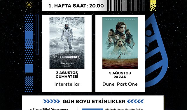 Çankaya Belediyesi’nin yaz akşamlarında Çankayalıları buluşturduğu Açık Hava Sinema Günleri devam ederken, Ahlatlıbel Atatürk Parkı’nda 2-24 Ağustos günleri arasında Uzay Filmleri Festivali gerçekleşecek. 2 Ağustos’tan itibaren hafta sonu iki gün yapılacak film gösterimlerinin yanı sıra çeşitli etkinlikler ve söyleşiler de düzenlenecek. Uzay bilgi yarışması, cosplay kostüm yarışması, teleskopla seyir, uzay oyunları, DJ performansları ve yüz boyama etkinlikleri saat 17.00 itibarıyla festivale katılanlara keyifli anlar yaşatacak.Uzay Filmleri Festivali söyleşilerinin ilk konuğu, 2 Ağustos Cumartesi saat 18.30’da "Astro Fotoğrafçılık. Antik Fotonları Yakalamak" konusu ile Mustafa Aydın olacak. 3 Ağustos Pazar 18.30’da ise Ankara Üniversitesi Fen Fakültesi Astronomi ve Uzay Bilimleri Bölümünden Prof. Dr. Kutluay Yüce, "Evrendeki Düzenli Yapılaşma" başlıklı söyleşi ile bilime ilgi duyan Başkentlilerle olacak.Ahalatlıbel Atatürk Parkı’nda 2-24 Ağustos tarihleri arasında saat 20.00 itibariyle düzenlenecek Uzay Filmleri Festivali’nin takvimi şöyle:-2 Ağustos Cumartesi - Interstellar-3 Ağustos Pazar – Dune: Part One-9 Ağustos Cumartesi – Arriva-10 Ağustos Pazar – Gravity-16 Ağustos Cumartesi - Dune: Part Two-17 Ağustos Pazar – Oblivion-23 Ağustos Cumartesi – The Martian-24 Ağustos Pazar – 2001: A Space OdysseyUzay Filmleri Festivali günlük programı ise şöyle:-17.00 – Uzay Temalı Oyun Alanı-17.00 – Yüz Boyama Etkinlikleri-18.30 – Uzay Söyleşileri-19.00 – Teleskopla Gökyüzü Gözlemi-19.15 – DJ Performansı-19.45 – Uzay Bilgi Yarışması-20.00 – Açık Hava Film Gösterimi