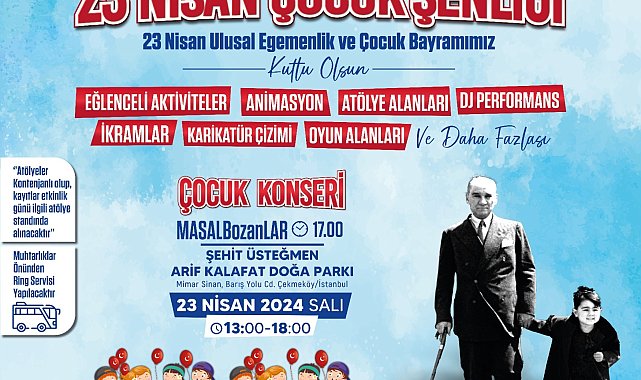 Çekmeköy Belediyesi, 23 Nisan Ulusal Egemenlik ve Çocuk Bayramı’nı, Şehit Üsteğmen Arif Kalafat Doğa Parkı’nda düzenleyeceği 23 Nisan Çocuk Şenliği ile kutlayacak.23 Nisan Ulusal Egemenlik ve Çocuk Bayramı, tüm yurtta olduğu gibi Çekmeköy’de de büyük bir coşku ve heyecanla kutlanacak. İlçe kaymakamlığı koordinasyonunda düzenlenecek resmi törenlerin ardından 13.00-18.00 saatleri arasında Şehit Üsteğmen Arif Kalafat Doğa Parkı’nda düzenlenecek 23 Nisan Çocuk Şenliği, 7’den 70’e binlerce vatandaşın katılımıyla bayram havasında geçecek. Eğlenceli aktiviteler, animasyon gösterileri, atölye alanları, DJ performans, ikramlar, karikatür çizimi atölyesi ve oyun alanları ile dolu dolu geçecek şenlikte final ''Masalbozanlar'' konseriyle yapılacak. Olası bir karışıklığın önüne geçilebilmesi ve tüm çocukların etkinliklerden faydalanabilmesi için şenlik alanında yer alacak atölyelerden faydalanmak isteyen vatandaşların aynı gün etkinlik alanında kayıt yaptırmaları gerekecek. Çocuk şenliğine katılmak isteyen vatandaşlar için tüm muhtarlıklardan 23 Nisan Salı Günü saat 11.00’den itibaren servisler kaldırılacak. Çekmeköy Belediye Başkanı Orhan Çerkez, tüm vatandaşları 23 Nisan Çocuk Şenliği’ne davet ederek, şunları söyledi:''Çekmeköy’de 23 Nisan Ulusal Egemenlik ve Çocuk Bayramı’mızı büyük bir coşku ve heyecanla tam bir bayram havasında kutlayacağız. Yavrularımızın yüzleri gülecek doyasıya eğlenecekler. Ailelerimiz de oluşturduğumuz bu sosyal ortamda bir nebze olsun nefes alacak ve rahatlayacaklar. Günün sonunda genç, yaşlı ve çocuk tüm yüzler gülecek. Bu gülümsemeler bizim çalışma şevkimizi artıracak, motivasyon kaynağımız olacak. İnanıyorum ki herkes doyasıya eğlenecek. Tüm komşularımı bu önemli şenlikte aramızda görmek dileğindeyim.''