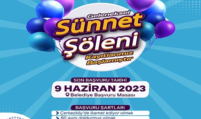 Çerkezköy Belediyesi'nin ilçede yaşayan ihtiyaç sahibi ailelerin çocukları için her yıl geleneksel olarak düzenlediği Toplu Sünnet Şöleni için kayıtlar başladı.Konuyla ilgili açıklama yapan Belediye Başkanı Vahap Akay, “Çerkezköy Belediyesi Sosyal Yardım İşleri Müdürlüğü’müzün, kentimizde yaşayan ihtiyaç sahibi aileler için her yıl geleneksel olarak yapmış olduğu toplu sünnet etkinliklerini, bu yıl da gerçekleştiriyoruz. Toplu sünnet kayıtlarımız 22 Mayıs 2023 Pazartesi günü (bugün) itibari ile başladı” dedi.Çerkezköy Belediyesi toplu sünnet etkinliğinde, ilçe sınırları içerisinde ikamet eden ihtiyaç sahibi ailelerin, 60 ayını doldurmuş çocukları için kayıt yaptırabileceklerini kaydeden Başkan Akay, “Toplu sünnet işlemleri için kayıt yaptırmak isteyen vatandaşlarımız Belediyemiz Halk Masalarına müracaat ederek başvurularını yapabilecekler. Toplu sünnet kayıtları için müracaatların, çocuğun kimlik fotokopisi ile yapılması gerekiyor” diye konuştu. DOKTOR KONTROLÜNDE VE STERİL BİR ORTAMDA YAPILACAKBaşvuruların tamamlanması ve yapılacak incelemenin ardından belirlenen ihtiyaç sahibi ailelerin çocuklarının doktor kontrolünde ve steril ortamda sünnetlerinin yapılacağını kaydeden Akay, “Sünnetlerimizin tamamlanmasının ardından sünnet olan yavrularımız için bir şenlik yapacağız. Tarihini daha sonra açıklayacağımız şenliğimizde sünnet olan yavrularımız ile bir araya gelerek, onların güzel bir gün geçirmelerini sağlayacağız” dedi.