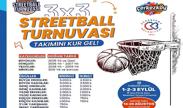 Çerkezköy Belediyesi’nin 5. Kültür ve Sanat Festivali kapsamında düzenlenecek Streetball Turnuvası’na başvurular 25 Ağustos’a dek devam edecek.Çerkezköy Belediyesi Kültür ve Sanat Festivali kapsamında 1-3 Eylül günlerinde yapılacak Streetball Turnuvası’na başvurular dün başladı. Turnuvaya ilişkin Çerkezköy Belediye Başkanı Vahap Akay, şu bilgileri verdi:“Kayıtlar 25 Ağustos Cuma günü sona erecek. Turnuvamız, Büyük Erkekler ve Kadınlar, Genç Erkekler ve Kadınlar, Yıldız Erkekler ve Kadınlar ile Küçük Erkekler ve Kadınlar kategorileri olmak üzere 8 ayrı kategoride yapılacak. Büyük Erkekler ve Kadınlar kategorilerine 2005 ve öncesi doğumlular, Genç Erkekler ve Kadınlar kategorilerine 2006 ve 2007 doğumlular, Yıldız Erkekler ve Kadınlar kategorilerine 2008 ve 2009 tarihi arasında doğanlar, Küçük Erkekler kategorisine ise 2010 ve sonrasındaki tarihlerde doğanlar katılabilecekler. Turnuvamıza katılmak isteyen takımlar Çerkezköy Belediyesi resmi internet sitemizdeki başvuru formlarını doldurarak kayıt yaptırabilecekler.”Streetball Turnuvası’nın 1 Eylül Cuma günü başlayacağını ve 3 Eylül Pazar günü müsabakaların tamamlanmasının ardından düzenlenecek ödül töreni ile sona ereceğini belirten Başkan Akay, “Müsabakalar Kartaltepe Piknik ve Mesire Alanı’ndaki Basketbol Sahası’nda oynanacak. 3 gün sürecek turnuvamızda kategorilerinde ilk iki sırayı alan takımlara ödülleri verilecek” dedi.DERECEYE GİRENLERE ÖDÜLLERİ VERİLECEKKategorilerde takım kontenjanlarının 20 ile sınırlı olduğuna dikkat çeken Akay, sözlerini şöyle tamamladı:“Turnuva sonucunda Büyükler kategorilerinde 1’inci olan takıma 5 bin TL, 2’nci olan takıma ise 3 bin 500 TL ödül verilecek. Gençler kategorilerinde 1’inciye 4 bin TL, 2’nciye 2 bin TL; Yıldızlar kategorilerinde 1’inciye 2 bin TL, 2’nciye bin TL; Küçükler kategorilerinde ise 1’inciye bin TL, 2’nciye 750 TL ödül verilecek. Turnuvada ayrıca 3’lük yarışması 1’incisine 750 TL, Smaç yarışması 1’incisine de 750 TL ödül verilecek. Şimdiden turnuvamıza katılacak olan takımlara ve sporcularımıza başarılar diliyorum. Turnuvamızın centilmenlik içerisinde ve bir şenlik havasında geçmesini ümit ediyorum.”