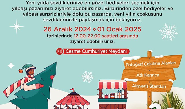 (İZMİR)- Çeşme Belediyesi, 26 Aralık 2024 - 1 Ocak 2025 tarihlerinde Cumhuriyet Meydanı’nda Yılbaşı Panayırı düzenleyecek. Tüm vatandaşları panayıra davet eden Başkan Lal Denizli, “Yeni yılın coşkusunu ve heyecanını hep birlikte yaşamak için tüm hemşehrilerimizi ve misafirlerimizi panayırımıza bekliyoruz” dedi.