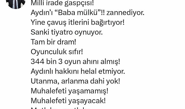 Bülbül: Aydın’ı baba mülkü zannediyorCHP Aydın Milletvekili Süleyman Bülbül ise, “Milli irade gaspçısı! Aydın’ı “Baba mülkü”!! zannediyor. Yine çavuş itlerini bağırtıyor! Sanki tiyatro oynuyor. Tam bir dram! Oyunculuk sıfır! 344 bin 3 oyun ahını almış! Aydınlı hakkını helal etmiyor. Utanma, arlanma dahi yok! Muhalefeti yaşamamış! Muhalefeti yaşayacak!Mutlaka.. mutlaka..Ve her şey çok güzel olacak” dedi.Karakoz: Hukuka ve demokrasiye ağır darbeCHP Aydın Milletvekili Evrim Karakoz da açıklamasında şu ifadelere yer verdi:“Büyükşehir Belediye Başkanı, Aydınlı hemşehrilerimizin oylarını yok sayarak seçmenin iradesine açıkça ihanet etmiştir. Mecliste 'Ben yaptım oldu, ne istersem onu yaparım' anlayışıyla hukuka ve demokrasiye ağır bir darbe vurulmuştur. Bu, hizmet siyaseti değil, kavga siyasetidir. 'Ben AKP dokunulmazlığı kazandım, ne istersem yaparım' anlayışının tezahürüdür. Bugün önergelerimizin gündeme alınması dahi reddedilmiş, meclis üyelerimiz provoke edilmeye çalışılmış, grup başkan vekilimize söz hakkı verilmemiştir. Kabul edilmeyen gündem maddeleri ise sanki kabul edilmiş gibi işlem görmüştür. Türkiye Cumhuriyeti bir hukuk devletidir ve kurallar herkesi bağlar. Ancak AKP zihniyetinin Aydın’da ve ülke genelinde sergilediği uygulamalardan anlaşılıyor ki, kural ve kanun tanımazlık maalesef genel bir davranış haline gelmiştir. Hukukun, adaletin, demokrasinin ve milletimizin yanında olduğumuzu bir kez daha vurguluyor, Aydınlı hemşehrilerimizin hakkını ve hukukunu sonuna kadar korumaya kararlı olduğumuzu bildiriyoruz."
