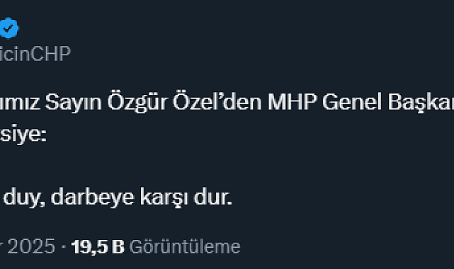 (ANKARA) - MHP'nin resmi sosyal medya hesabı üzerinden Devlet Bahçeli’nin CHP Genel Başkanı Özgür Özel’e yönelik "Yargıya saygı duy, partinde otur" mesajına Özel’den yanıt geldi. CHP’nin resmi sosyal medya hesabından Özgür Özel de Bahçeli’ye yönelik “Milletin sesini duy, darbeye karşı dur” dedi.İstanbul Cumhuriyet Başsavcılığının yürüttüğü üç soruşturma kapsamında aralarında İstanbul Büyükşehir Belediye Başkanı Ekrem İmamoğlu'nun da aralarında bulunduğu 106 kişi için gözaltı kararı verilmesinin ardından tepkiler üçüncü gününe girdi. CHP Genel Başkanı Özgür Özel'e MHP'nin resmi sosyal medya hesabı üzerinden seslenen MHP Genel Başkanı Devlet Bahçeli, "Yargıya saygı duy, partinde otur" ifadelerini kullandı. Bunun üzerine CHP’nin resmi sosyal medya hesabından da “Genel Başkanımız Sayın Özgür Özel’den MHP Genel Başkanı Devlet Bahçeli’ye tavsiye: Milletin sesini duy, darbeye karşı dur” paylaşımı yapıldı.