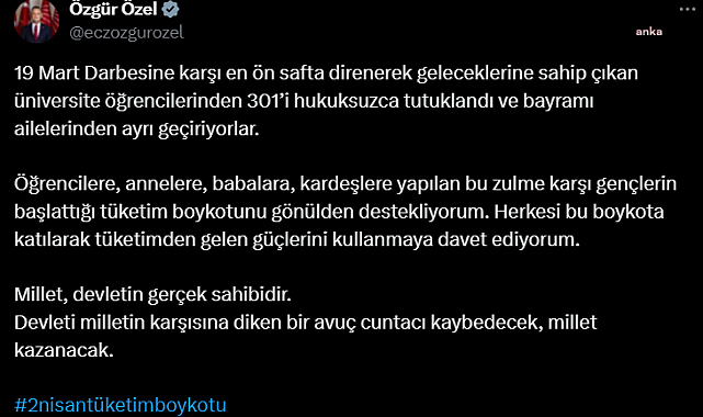 (ANKARA)-CHP Genel Başkanı Özgür Özel, "Gençlerin başlattığı tüketim boykotunu gönülden destekliyorum. Herkesi bu boykota katılarak tüketimden gelen güçlerini kullanmaya davet ediyorum. Millet, devletin gerçek sahibidir. Devleti milletin karşısına diken bir avuç cuntacı kaybedecek, millet kazanacak." ifadesini kullandı.CHP Genel Başkanı Özgür Özel sosyal medya hesabından yaptığı açıklama ile gençler tarafından başlatılan tüketim boykotuna destek verdiğini belirtti. Özel, açıklamasında şunları kaydetti:"19 Mart Darbesine karşı en ön safta direnerek geleceklerine sahip çıkan üniversite öğrencilerinden 301’i hukuksuzca tutuklandı ve bayramı ailelerinden ayrı geçiriyorlar. Öğrencilere, annelere, babalara, kardeşlere yapılan bu zulme karşı gençlerin başlattığı tüketim boykotunu gönülden destekliyorum. Herkesi bu boykota katılarak tüketimden gelen güçlerini kullanmaya davet ediyorum. Millet, devletin gerçek sahibidir. Devleti milletin karşısına diken bir avuç cuntacı kaybedecek, millet kazanacak."