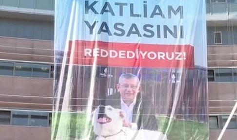 (ANKARA) - CHP Genel Merkezi'ne "Katliam Yasasını Reddediyoruz" yazılı pankart asıldı.CHP Genel Başkanı Özgür Özel başkanlığında toplanan MYK toplantısı devam ederken parti binasına, TBMM Tarım, Orman ve Köyişleri Komisyonu'nda görüşmeleri devam eden sokak hayvanlarına yönelik yasa teklifine tepki göstermek adına Genel Başkan Özgür Özel ve Mira isimli köpeğinin fotoğrafının olduğu "Katliam Yasasını Reddediyoruz" yazılı pankart asıldı.'Biz yaşatmayı seçiyoruz' etiketli pankartta Özel'in "Geçen sene barınakta tanıştığım Mira sahiplenildi ve üç bacağıyla sağlıkla yaşıyor" dediği Mira isimli köpekle olan fotoğrafı yer aldı.