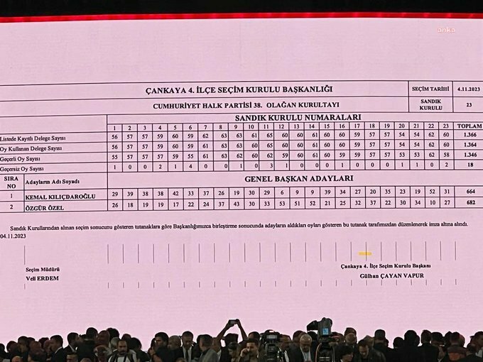 CHP Kurultayı’nda, Genel Başkanlık için yapılan oylamada CHP Genel Başkanı Kemal Kılıçdaroğlu 664 oy alırken, CHP Grup Başkanı Özgür Özel’e ise 682 oy çıktı. CHP Tüzüğü’ne göre, Genel Başkan seçilebilmek için salt çoğunluk olan en az 684 oy almak gerektiği için Genel Başkanlık seçimi ikinci tura kaldı.Kurultay’da Genel Başkanlık için 1364 delegenin oy kullandığı ilk tur seçim sonuçları saat 23.25’te açıklandı. Özgür Özel 682, Kemal Kılıçdaroğlu 664 oy aldı. CHP Tüzüğü’ne göre Genel Başkanlık seçiminde, adayın salt çoğunluğu sağlaması gerekiyor. Kurultayda delege sayısı 1366 olduğu için Genel Başkan seçiminde adayın en az 684 oy alması gerekiyor. Bu nedenle CHP Kurultayı’nda Genel Başkanlık için ikinci tur oylama saat 23.45’te başlayacak.CHP Tüzüğü’nün 19. maddesi şöyle:“Genel Başkan, kurultayca gizli oyla ve üye tam sayısının salt çoğunluğuyla seçilir. İlk iki oylamada sonuç alınamaz ise, üçüncü oylamada en çok oy alan aday seçilir.”