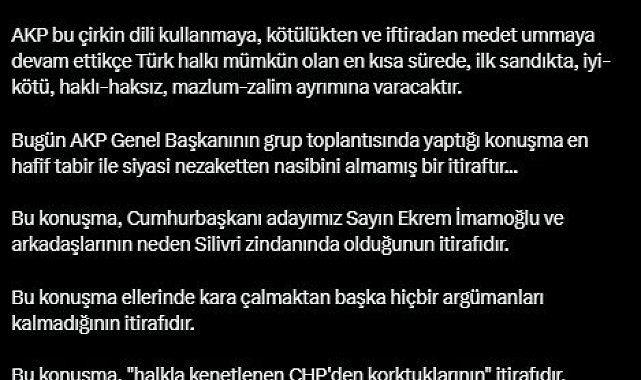 (ANKARA)-CHP Sözcüsü Deniz Yücel, "Cumhurbaşkanlığının kendisine tapulu olduğunu zannedenler, bir gün o koltuklarından kalkacakları gerçeğini yok sayıp Erdoğan’ın karşısına çıkan her adayın 'telef' olacağını söyleme hadsizliğinde bulunanlar, er ya da geç sandıkta cevabını alacaktır. Böyle kifayetsiz bir yönetimi hak etmeyen bir asırlık Türkiye Cumhuriyeti, çok yakında layık olduğu şekilde yönetilecektir" dedi.CHP Parti Sözcüsü Deniz Yücel sosyal medya hesabı üzerinden Cumhurbaşkanı ve AK Parti Genel Başkanı Recep Tayyip Erdoğan’ın Türkiye Büyük Millet Meclisi’ndeki (TBMM) AK Parti grup toplantısında CHP’ye yönelik sözlerine ve Ekrem İmamoğlu hakkında "telef" ifadesini kullanmasına tepki gösterdi. Yücel, açıklamasında şu ifadeleri kullandı:"Bu ülkenin başına gelmiş en büyük felaket ‘Vizyonsuz, basiretsiz ve başarısız AKP İktidarıdır...’ Hiç şüphesiz AKP, Türk siyaset tarihine, hadsiz açıklamaları ve seviyesiz konuşmaları ile geçecektir. Herkese tepeden bakan, halktan kopan, en çok da millet iradesine göz diken bu iktidarın CHP korkusu, 19 Mart darbe girişimi ile tescillenmiştir. AKP, anketlerdeki, sokaklardaki, çarşı pazardaki gerçek tabloya gözlerini kapatıp Türkiye'nin birinci partisi için ‘dibe vuruyorlar’ diyecek kadar çaresizliğe düşmüştür. AKP bu çirkin dili kullanmaya, kötülükten ve iftiradan medet ummaya devam ettikçe Türk halkı mümkün olan en kısa sürede, ilk sandıkta, iyi-kötü, haklı-haksız, mazlum-zalim ayrımına varacaktır.Bugün AKP Genel Başkanının grup toplantısında yaptığı konuşma en hafif tabir ile siyasi nezaketten nasibini almamış bir itiraftır... Bu konuşma, Cumhurbaşkanı adayımız Sayın Ekrem İmamoğlu ve arkadaşlarının neden Silivri zindanında olduğunun itirafıdır. Bu konuşma ellerinde kara çalmaktan başka hiçbir argümanları kalmadığının itirafıdır. Bu konuşma, ‘halkla kenetlenen CHP'den korktuklarının’ itirafıdır. Bu konuşma, günden güne otoriterleşenlerin sandık korkusunun itirafıdır. CHP ile siyaset arenasında mertçe yarışmayı gözü kesmeyenler, Cumhurbaşkanlığının kendisine tapulu olduğunu zannedenler, bir gün o koltuklarından kalkacakları gerçeğini yok sayıp Erdoğan’ın karşısına çıkan her adayın ‘telef’ olacağını söyleme hadsizliğinde bulunanlar, er ya da geç sandıkta cevabını alacaktır. Böyle kifayetsiz bir yönetimi hak etmeyen bir asırlık Türkiye Cumhuriyeti, çok yakında layık olduğu şekilde yönetilecektir. Hepimiz biliyoruz ki; ‘Hiç bir korkuya benzemez halkını satanın korkusu…’"