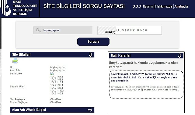 (ANKARA)- CHP'nin boykot listesini paylaştığı boykotyap.com’un ardından boykotyap.net'de mahkeme kararıyla erişime engellendi.CHP’nin İstanbul Büyükşehir Belediye (İBB) Başkanı Ekrem İmamoğlu'nun tutuklanmasının ardından açtığı boykot sitesine yönelik yeni karar. İstanbul 2. Sulh Ceza Hakimliği'nin kararıyla CHP tarafından oluşturulan boykotyap.net'le birlikte boykotla.app erişime engellendi.Daha önce de İBB Başkanı Ekrem İmamoğlu’nun tutuklanmasının ardından başlatılan boykotlar kapsamında CHP tarafından oluşturulan ve boykot edilen markaların listelendiği boykotyap.com'la birlikte yandaslarboykot.com, boykot.web.tr ve guncelboykot.com web siteleri, Ankara 4. Sulh Ceza Hakimliğinin 27 Mart 2025 tarihli ve 2025/4129 sayılı kararıyla erişime engellenmişti.