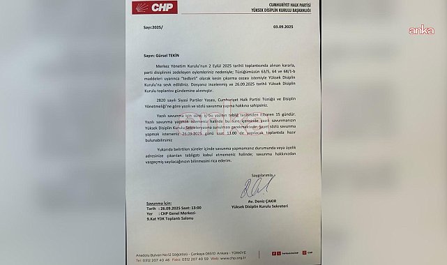 (ANKARA) - CHP Yüksek Disiplin Kurulu (YDK), mahkeme kararıyla CHP İstanbul İl Yönetimine geçici olarak atanan eski CHP Milletvekili Gürsel Tekin hakkında yürütülen disiplin sürecine ilişkin takvimi açıkladı. YDK, Tekin'e yazılı savunma yapması için 15 gün süre tanıdı. Tekin, sözlü savunma yapmak isterse 26 Eylül'de yapılacak YDK toplantısında sözlü savunma yapabilecek.CHP Merkez Yönetim Kurulu'nun (MYK) 2 Eylül'deki toplantısında alınan kararla "parti disiplinini zedeleyen eylemleri" gerekçesiyle tedbirli olarak kesin çıkarma cezası istemiyle YDK'ya sevk edilen Tekin'in dosyası, 26 Eylül'de kurul toplantısında görüşülecek.YDK Sekreteri Avukat Deniz Çakır imzasıyla Tekin'e gönderilen tebligatta, yazılı savunma için 15 günlük süre tanındı. Tekin'in sözlü savunma yapmak istemesi halinde ise 26 Eylül saat 13.00'te CHP Genel Merkezi'nde hazır bulunabileceği bildirildi.Tebligatta ayrıca, belirtilen süreler içinde savunma yapılmaması ya da tebligatın kabul edilmemesi halinde Tekin’in savunma hakkından feragat etmiş sayılacağı ifade edildi.