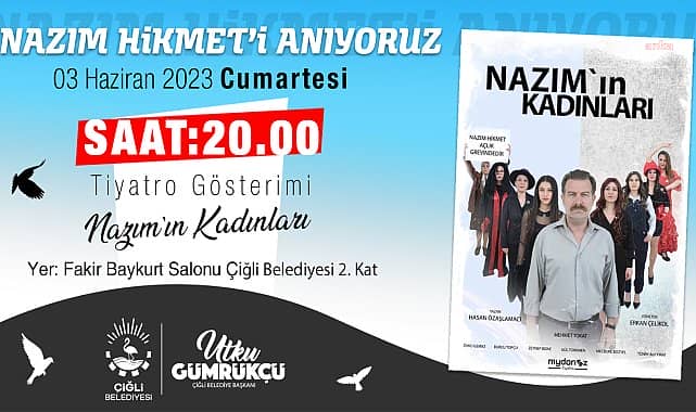 Çiğli Belediyesi Kültür ve Sosyal İşler Müdürlüğü’nün organize edeceği Nazım Hikmet’i anma etkinliği, 3 Haziran Cumartesi günü saat 20.00’de Fakir Baykurt Salonu’nda gerçekleştirilecek. Etkinlikte, yönetmenliğini Erkan Çelikol’un yaptığı, oyuncu kadrosunu Mehmet Tokat, Öykü Gemici, Burcu Topçu, Zeynep Bone, Gül Türkmen, Mecbure Bozyel ve Tünay Alp Fırat’ın oluşturduğu tek perdelik “Nazım’ın Kadınları” isimli tiyatro gösterimi, ücretsiz olarak sahnelenecek.
