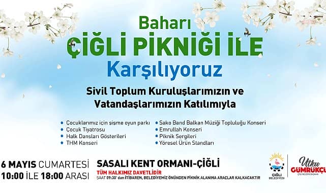 Çiğli Belediyesi’nin organize edeceği piknik, 6 Mayıs Cumartesi günü 10.00-18.00 saatleri arasında Sasalı Kent Ormanı'nda gerçekleştirilecek. Sivil toplum kuruluşlarının ve vatandaşların katılım göstereceği piknikte çocuklar için şişme oyun parkı, çocuk tiyatrosu, halk dansları gösterileri, THM Konseri, Sako Band Balkan Müziği Topluluğu ve Emrullah konseri düzenlenecek. Etkinlikte piknik sergileri ve yöresel ürün stantları da kurulacak. Etkinliğe katılmak isteyenler için 6 Mayıs Cumartesi günü saat 09.30’dan itibaren piknik alanına araç kaldırılacak.