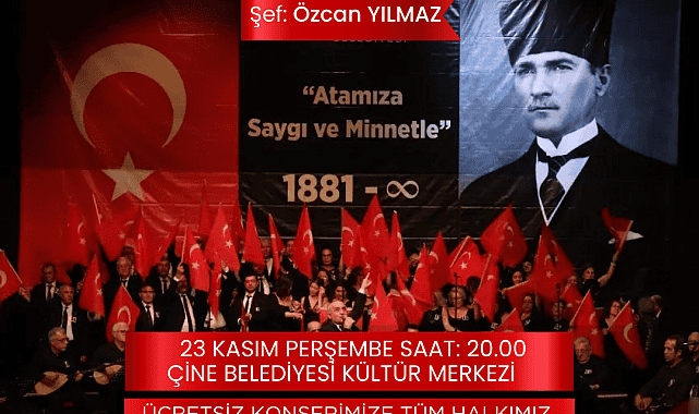 Ulu Önder Gazi Mustafa Kemal Atatürk, vefatının 85’inci yılında Çine’de ‘Atatürk’ün Sevdiği Türküler’ ile bir kez daha anılacak.Şef Özcan Yılmaz yönetimindeki Aydın Büyükşehir Belediyesi Türk Halk Müziği Korosu’nun sahne alacağı konserde Ata’nın en sevdiği türküler seslendirilecek. Aydın Büyükşehir Belediyesi organizasyonunda Çine Belediyesi’nin ev sahipliğinde 23 Kasım Perşembe günü saat 20.00’de Çine Kültür Merkezi’nde gerçekleşecek konsere, tüm Çine halkı ücretsiz katılabilecek.Tüm Çine halkını Ulu Önder Gazi Mustafa Kemal Atatürk'ü anmaya, Ata’nın sevdiği türküleri hep birlikte eşlik etmeye davet eden Çine Belediye Başkanı Enver Salih Dinçer, "Atamızı saygı, sevgi, minnet ve özlemle anacağımız konserimize tüm halkımızı bekliyorum" diye konuştu.