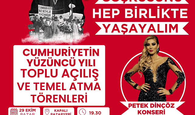 29 Ekim Pazar günü Çine Belediyesi Kapalı Pazaryeri’nde saat 19.30’da toplu açılış ve temel atma törenleriyle başlayacak olan Cumhuriyet Bayramı heyecanı, aynı akşam ünlü şarkıcı Petek Dinçöz’ün sahne alacağı muhteşem bir konserle devam edecek.