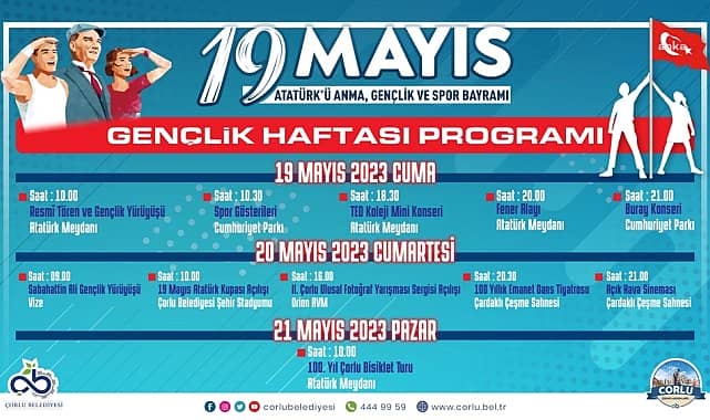 Çorlu Belediyesi, 19 Mayıs Atatürk’ü Anma, Gençlik ve Spor Bayramı’nı coşkuyla kutlamak için bir dizi etkinlik düzenleyecek. Çorlu Gençlik Haftası; 19 Mayıs Cuma günü saat 10.00’da Atatürk Meydanı’ndaki resmi kutlama töreni ile başlayacak ve Cumhuriyet Parkı’nda sona erecek Gençlik Yürüyüşü ile devam edecek. Yürüyüşün ardından saat 10.30’da Cumhuriyet Parkı’nda Çorlulu öğrenciler, spor gösterileriyle seyirci karşısında olacak.19 Mayıs’ta kutlamalar akşam daha büyük bir coşkuyla devam edecek. Saat 18.30’da Atatürk Meydanı’nda TED Koleji öğrencileri konser verecek. Saat 20.00’de ise binlerce Çorlulu'nun katılımıyla fener alayı düzenlenecek. Atatürk Meydanı’ndan başlayacak fener alayı, Cumhuriyet Parkı’nda son bulurken saat 21.00’de şarkıcı Buray, ilçelilerle buluşacak.Kutlamalar, 20 Mayıs 2023 Cumartesi günü saat 09.00’da gençler için düzenlenecek doğa yürüyüşüyle sürecek. ‘Sabahattin Ali Gençlik Yürüyüşü’nde gençler, Sabahattin Ali’nin vefat ettiği yere bir doğa yürüyüşü yapacak. Saat 10.00’da Çorlu Belediyesi Şehir Stadyumu’nda 19 Mayıs Atatürk Kupası’nın açılış programı yapılacak ve genç futbolcular turnuvada kıyasıya yarışacak. Saat 16.00’da ise 2. Çorlu Ulusal Fotoğraf Yarışması’nda dereceye giren yarışmacıların fotoğraflarının sergileneceği sergi Orion AVM’de açılacak.Gençlik Haftası programı, akşam Çardaklı Çeşme Sahnesi etkinlikleri ile devam edecek. Saat 20.30’da ‘100 Yıllık Emanet Dans Tiyatrosu’ Çardaklı Çeşme Sahnesi’nde olacak. Saat 21.00’de ise açık hava sinemasında vatandaşlar film izleyecek.21 Mayıs 2023 Pazar günü, 100. Yıl Çorlu Bisiklet Turu’nda bisikletseverler spor için buluşacak. Saat 10.00’da Atatürk Meydanı’nda başlayacak tur; Orion Avm ve Gölbaşı Gençlik Parkı güzergahını takip edecek. Gölbaşı Gençlik Parkı’nda mola verildikten sonra Bisiklet Kafe’ye doğru dönüş yolculuğuna çıkılacak. Bisiklet Kafe’de son bulacak bisiklet turunda müzik etkinlikleri, hediye çekilişleri yapılırken katılımcılara da çeşitli ikramlarda bulunulacak.