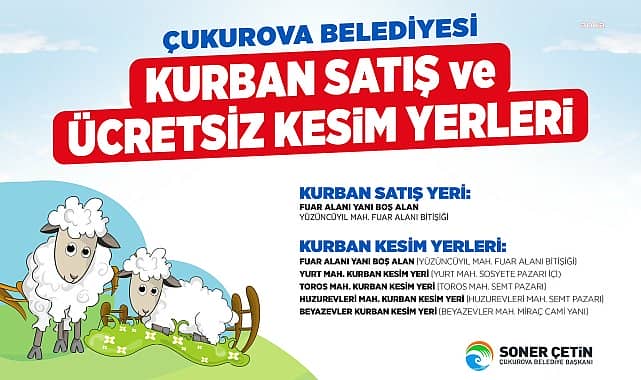Çukurova Belediyesi, yaklaşan Kurban Bayramı öncesinde yetki ve sorumluluk alanlarında tüm hazırlıklarını tamamladı. Çukurova Belediyesi, kurban satış ve kesim yerlerini belirledi.Kurban Bayramı için Çukurova ilçesinde Yurt Mahallesi Sosyete Pazarı içi, Toros Mahallesi Semt Pazarı, Huzurevleri Mahallesi Semt Pazarı, Beyazevler Mahallesi Miraç Camii yanı ve Yüzüncüyıl Mahallesi Fuar Alanı yanındaki boş alanlar, kurban satış yerleri olarak belirlendi.Kurban kesimi ise Yüzüncüyıl Mahallesi Fuar Alanı bitişiğindeki boş alanda yapılabilecek. Çukurova Belediyesi’nin belirlediği alanlar dışında kurban satış ve kesiminin yapılmasına, halk sağlığı göz önüne alınarak izin verilmeyeceği bildirildi.