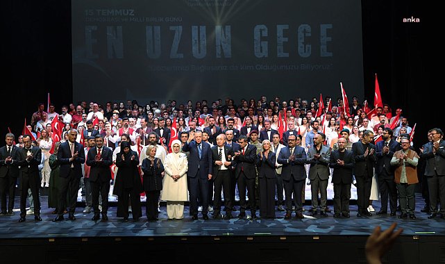 (ANKARA) - Cumhurbaşkanı Recep Tayyip Erdoğan, 15 Temmuz darbe girişiminde yaşananları sanatla anlatan "En Uzun Gece"nin ilk temsilini izledi.Cumhurbaşkanlığı tarafından hazırlanan ve Beştepe Millet Kongre ve Kültür Merkezi'nde sahnelenen "destan", 15 Temmuz Demokrasi ve Millî Birlik Günü kapsamında ilk kez izleyiciyle buluştu.Temsilde, dönemin Terörle Mücadele Daire Başkanı Turgut Aslan'ın, Fetullahçı Terör Örgütü (FETÖ) soruşturması süreci ve yakalanacaklarını anlayarak harekete geçen terör örgütü üyelerine karşı verilen mücadele ele alınıyor.Darbe girişiminin en sıcak anlarının yaşandığı Emniyet Genel Müdürlüğü, Jandarma Genel Komutanlığı, Özel Kuvvetler Komutanlığı ve 15 Temmuz Şehitler Köprüsü gibi kritik noktaların arka plan olarak kullanıldığı temsil boyunca Mehmet Akif Ersoy, Sezai Karakoç, Abdurrahim Karakoç, Bahtiyar Vahapzade, Nurullah Genç ve Attila İlhan gibi isimlerin şiirlerinden bestelenen eserlerle, birlik ve direniş ruhu da sahneye taşındı.Temsil sırasında, 15 Temmuz gecesi vefat eden 253 şehidin ismi perdeye tek tek yansıtıldı.Ayrıca Cumhurbaşkanı Erdoğan’ın 15 Temmuz gecesi yurttaşlara yönelik çağrısı ve aynı gece şehirlerde kaydedilen görüntüler de izleyicilere sunuldu. Sahnedeki dev Türk bayrağı ise uzun süre alkışlandı. Gösteri sonunda Cumhurbaşkanı Başdanışmanı ve 15 Temmuz gazisi Turgut Aslan ve eşi Nadire Aslan ile Ömer Halisdemir’in ailesi sahneye davet edildi. Cumhurbaşkanı Erdoğan ve eşi Emine Erdoğan, temsilin hazırlanmasında emeği geçenleri tebrik etti.Temsile TBMM Başkanı Numan Kurtulmuş, Cumhurbaşkanı Yardımcısı Cevdet Yılmaz, bakanlar, AK Parti yöneticileri ve Cumhurbaşkanlığı yetkilileri de katıldı.