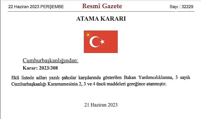 Cumhurbaşkanı Recep Tayyip Erdoğan’ın imzasıyla Resmi Gazete’de yayınlanan karara göre, 17 bakanlığa 68 bakan yardımcısı atandı. Eski AKP Grup Başkanvekili Bülent Turan, İçişleri Bakan Yardımcısı ve eski TÜGVA Başkanı Enes Eminoğlu Gençlik ve Spor Bakan Yardımcısı olurken; Adalet Bakan Yardımcısı Akın Gürlek, yeniden aynı göreve getirildi.Cumhurbaşkanı Recep Tayyip Erdoğan’ın imzasıyla bakan yardımcıları atamaları Resmi Gazete’nin bugünkü sayısında yayınlandı. Karara göre; 17 bakanlığa 68 bakan yardımcısı atandı.Eski AKP Grup Başkanvekili Bülent Turan, Emniyet Genel Müdürü Mehmet Aktaş, Eski Diyarbakır Valisi ve Belediye kayyumu müfettiş Münir Karaloğlu İçişleri Bakan Yardımcılığına atandı. Eski TÜGVA Başkanı Enes Eminoğlu Gençlik ve Spor Bakan Yardımcılığı görevine getirildi.Eski Milli Güreşçi ve eski Vakıfbank Yönetim Kurulu Üyesi Hamza Yerlikaya, Gençlik ve Spor Bakan Yardımcısı; eski hakim Akın Gürlek Adalet Bakan Yardımcısı, Cumhurbaşkanı Başdanışmanı olarak görevlendirilen Fatma Betül Sayan Kaya’nın kardeşi Ömer Fatih Sayan Ulaştırma ve Altyapı Bakan Yardımcısı olarak yeniden atandı.Eski AKP milletvekilleri Ramazan Can, Ahmet Aydın, Ahmet Berat Çonkar, Abdullah Erdem Cantimur, Alpaslan Kavaklıoğlu, Şuay Alpay, Ebubekir Gizligider ve Osman Boyraz, bakan yardımcısı olarak atanan isimler arasında yer aldı.Bakan Yardımcısı atamaları şöyle:Adalet Bakan Yardımcıları: Akın Gürlek, Hasan Yılmaz, Niyazi Acar, Ramazan Can.Aile ve Sosyal Hizmetler Bakan Yardımcıları: Leman Yenigün, Rıdvan Duran, Sevim Sayim Madak, Zafer Tarikdaroğlu.Çalışma ve Sosyal Güvenlik Bakan Yardımcıları: Adnan Ertem, Ahmet Aydın, Faruk Özçelik, Lutfihak Alpkan.Çevre Şehircilik ve İklim Değişikliği Bakan Yardımcıları: Fatma Varank, Hasan Suver, Refik Tuzcuoğlu, Vedad Gürgen.Dışişleri Bakan Yardımcıları: Ahmet Yıldız, Burak Akçapar, Mehmet Kemal Bozay, Yasin Ekrem Serim.Enerji ve Tabii Kaynaklar Bakan Yardımcıları: Abdullah Tancan, Ahmet Berat Çonkar, Nevzat Şatıroğlu, Zafer Demircan.Gençlik ve Spor Bakan Yardımcıları: Enes Eminoğlu, Halis Yunus Ersöz, Hamza Yerlikaya, Safa Koçoğlu.Hazine ve Maliye Bakan Yardımcıları: Abdullah Erdem Cantimur, İsmail İlhan Hatipoğlu, Osman Çelik, Zekeriya Kaya.İçişleri Bakan Yardımcıları: Bülent Turan, Mehmet Aktaş, Mehmet Sağlam, Münir Karaloğlu.Kültür ve Turizm Bakan Yardımcıları: Batuhan Mumcu, Gökhan Yazgı, Nadir Alpaslan, Serdar Çam.Milli Eğitim Bakan Yardımcıları: Celile Eren Ökten, Kemal Şamlıoğlu, Nazif Yılmaz, Ömer Faruk Yelkenci.Milli Savunma Bakan Yardımcıları: Alparslan Kavaklıoğlu, Bilal Durdalı, Celal Sami Tüfekci, Şuay Alpay.Sağlık Bakan Yardımcıları: Huzeyfe Yılmaz, Hüseyin Kürşat Kırbıyık, Şuayip Birinci, Tolga Tolunay.Sanayi ve Teknoloji Bakan Yardımcıları: Ahmet Yozgatlıgil, Çetin Ali Dönmez, Oruç Baba İnan, Zekeriya Çoştu.Tarım ve Orman Bakan Yardımcıları: Ahmet Bağcı, Ahmet Gümen, Ebubekir Gizligider, Veysel Tiryaki.Ticaret Bakan Yardımcıları: Mahmut Gürcan, Mustafa Tuzcu, Özgür Volkan Ağar, Sezai Uçarmak.Ulaştırma ve Altyapı Bakan Yardımcıları: Durmuş Ünüvar, Enver İskurt, Osman Boyraz, Ömer Fatih Sayan.