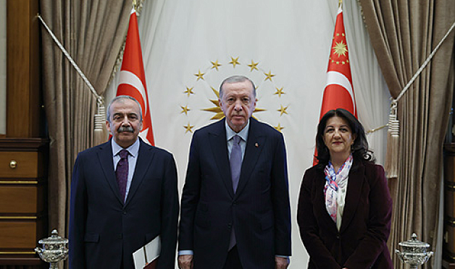 (ANKARA) - MHP Genel Başkanı Devlet Bahçeli’nin 1 Ekim 2024’te TBMM'deki "tokalaşmasıyla" başlayan ve Abdullah Öcalan’ın 27 Şubat’ta yaptığı “silah bırakma ve örgütü feshetme” çağrısıyla devam eden süreçte, Cumhurbaşkanı Recep Tayyip Erdoğan, DEM Parti İmralı Heyeti'ni Cumhurbaşkanlığı’nda kabul etti.Cumhurbaşkanı Recep Tayyip Erdoğan, Van Milletvekili Pervin Buldan ile TBMM Başkanvekili ve İstanbul Milletvekili Sırrı Süreyya Önder'in yer aldığı DEM Parti İmralı heyetini, Beştepe’deki Cumhurbaşkanlığı'nda ağırladı.Görüşmede, Cumhurbaşkanı Erdoğan'ın yanı sıra, MİT Başkanı İbrahim Kalın ve önceki dönemde de çözüm sürecinde yer alan AK Parti Genel Başkanvekili ve Bursa Milletvekili Efkan Ala yer aldı.Cumhurbaşkanlığındaki kabul, 1 saat 20 dakika sürdü.DEM Parti'nin görüşmeye ilişkin yazılı açıklama yapması bekleniyor.