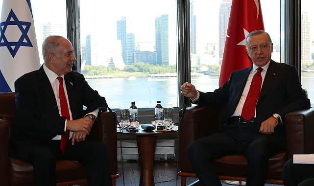 Cumhurbaşkanı Recep Tayyip Erdoğan, Birleşmiş Milletler (BM) 78. Genel Kurulu'na katılmak üzere gittiği New York'ta İsrail Başbakanı Benjamin Netanyahu ile görüştü. Erdoğan sosyal medya hesabından görüşmeye ilişkin şu paylaşımı yaptı:"BM 78’inci Genel Kurul temaslarımız kapsamında İsrail Başbakanı Binyamin Netanyahu ile bir görüşme gerçekleştirdik. İstişarelerimiz ülkemiz ve bölgemiz için hayırlara vesile olsun."İsrail Başbakanlık Ofisi'nden yapılan yazılı açıklamada ise şu ifadelere yer verildi:"New York'taki Türkevi'nde Türkiye Cumhurbaşkanı Recep Tayyip Erdoğan ile bir araya gelen Başbakan Binyamin Netanyahu, iki ülke arasındaki ilişkilerin gelişmekte olduğunu belirtti. İki lider ticaret, ekonomi ve enerji alanlarında ikili ilişkileri ilerletmeye devam etme kararı aldı.Liderler, İsrail ve Suudi Arabistan arasındaki normalleşme de dâhil olmak üzere bölgesel ve uluslararası konuları da ele aldı.Başbakan Netanyahu, İstanbul'daki İsrail hedeflerine saldırmak isteyen terör hücrelerinin kötü niyetlerini engelleyerek hayat kurtaran güvenlik birimlerinin verimli işbirliği için Türkiye Cumhurbaşkanı'na teşekkür etti.İki lider İsrail ve Türkiye'yi ziyaret etmeleri için karşılıklı davetlerde bulundu. Yakın zamanda yapılacak ziyaretlerin düzenlenmesi konusunda mutabık kalındı."Reklam
