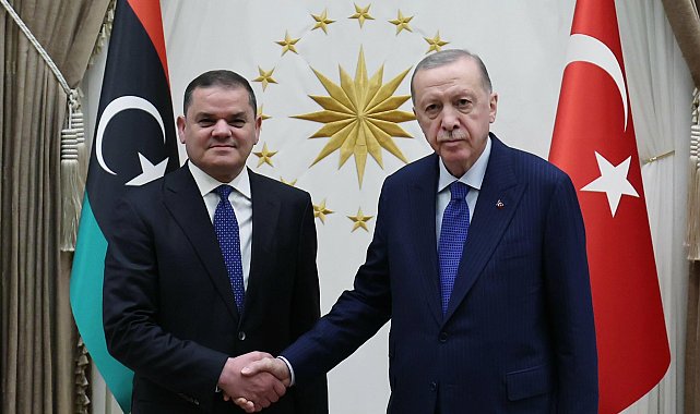 (ANKARA) - Cumhurbaşkanı Recep Tayyip Erdoğan, Libya Milli Birlik Hükümeti Başbakanı Abdulhamid Dibeybe’yi Cumhurbaşkanlığı'nda kabul etti. Görüşmede, Türkiye ile Libya arasındaki ikili ilişkiler ile bölgesel ve küresel konuların ele alındığı belirtildi. Erdoğan, Doğu Akdeniz'de iki ülkenin ortak çıkarlarının korunması için temas ve işbirliğinin süreceğini vurguladı.İletişim Başkanlığı'nın resmi sosyal medya hesabından yaptığı açıklamaya göre, Cumhurbaşkanı Erdoğan, Libya Milli Birlik Hükümeti Başbakanı Dibeybe'yi Cumhurbaşkanlığı'nda kabul etti. Kabulde Türkiye ile Libya arasındaki ikili ilişkiler ile bölgesel ve küresel konular ele alındı. Erdoğan, Milli Birlik Hükümeti'nin Türkiye için Libya'daki meşru muhatap olduğunu belirterek, iki ülke arasında enerji, güvenlik ve denizcilik başta olmak üzere birçok alanda ilişkileri geliştirmeye devam edeceklerini ifade etti.Erdoğan, Doğu Akdeniz’de Türkiye ve Libya’nın ortak çıkarlarının korunması için yakın temas ve iş birliğinin süreceğini kaydetti.