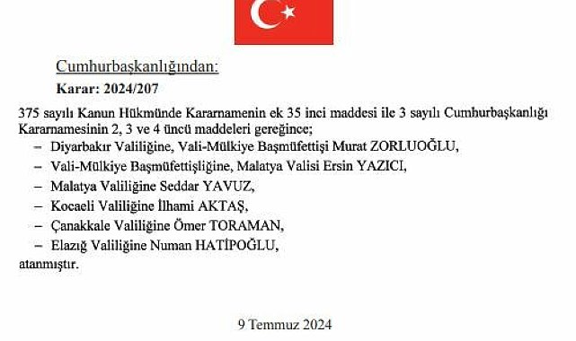 (ANKARA) - Cumhurbaşkanlığı atama kararları Resmi Gazete'de yayımlandı. 5 ilin valisi değişti.Cumhurbaşkanı Recep Tayyip Erdoğan imzalı Cumhurbaşkanlığı Kararnamesi ile Cumhurbaşkanlığı Kararnamesi'nde değişiklik yapıldı. 22 maddelik karar, Resmi Gazete'de yayımlandı. Karara göre; " 75 sayılı Kanun HÜkmünde Karanamenin ek 45 inci maddesi ile 3 sayılı Cumhurbaşkanlığı Kararnamesinin 2,3 ve 4 üncü maddeleri gereğince; Diyarbakır Valiliği'ne, Vali-Mülkiye Başmüfettişi Murat Zorluoğlu, Malatya Valiliği'ne Seddar Yavuz, Kocaeli Valiliği'ne İlhami Aktaş, Çanakkale Valiliği'ne Ömer Toraman, Elazığ Valiliği'ne Numan Hatipoğlu atandı"