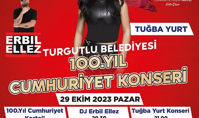Turgutlu Belediyesi'nin Cumhuriyet’in 100’üncü yıl dönümü dolayısıyla düzenlediği etkinliklerin son gününde Cumhuriyet Bayramı coşkusu tüm kentte yankılanacak. Kutlamalar kapsamında 29 Ekim Pazar günü 100.Yıl Cumhuriyet Korteji, Dj Erbil Ellez ve Tuğba Yurt konseri düzenlenecek.Turgutlu Belediyesi, Cumhuriyet'in 100. kuruluş yıl dönümünü etkinliklerle kutlamaya devam ediyor. Turgutlu Belediyesi ev sahipliğinde 25-29 Ekim günleri arasında gerçekleştirilen etkinliklerin son gününde 100.Yıl Cumhuriyet Korteji, Dj Erbil Ellez ve Tuğba Yurt konseri düzenlenecek. Kutlamalar, 29 Ekim Pazar günü saat 19.30’da Koza Parkı Kavşağı önünden 100.Yıl Cumhuriyet Korteji ile başlayacak. Kortej yürüyüşünün ardından Dj Erbil Ellez eğlenceli şarkılarıyla 15 Temmuz Demokrasi Şehitleri Alanı’nda saat 20.30’da sahne alacak.Turgutlu Belediyesi tarafından düzenlenen Cumhuriyet Konserinde ise sevilen şarkıcı Tuğba Yurt sahne alacak. 29 Ekim Pazar günü 15 Temmuz Demokrasi Şehitleri Alanı’nda sevenleriyle buluşacak olan Tuğba Yurt'un konseri saat 21.00’de başlayacak. Turgutlu Belediyesi ev sahipliğinde 5 gün boyunca devam eden Cumhuriyet Bayramı kutlamaları bu konserle ile son bulacak.Turgutlu Belediye Başkanı Çetin Akın, “Turgutlu’muzda Cumhuriyet Bayramımızın 100.yılını bizlere yakışır bir şekilde kutlamaya devam ediyoruz. Etkinliklerimizin son gününde düzenleyeceğimiz 100.Yıl Cumhuriyet Korteji ve Cumhuriyet Konseri ile bayram coşkumuzu meydanlara taşıyacağız. Tüm vatandaşlarımızı Cumhuriyet Bayramımızın 100. yılı kutlamalarımıza katılmaya davet ediyorum. Cumhuriyetimizin gururunu ve coşkusunu hep birlikte kutlayalım” dedi.