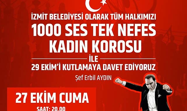 İzmit Belediyesi'nin kadınların toplumdaki yerini ve görünürlüğünü arttırmak amacıyla oluşturduğu 1000 Ses Tek Nefes Kadın Korosu, Cumhuriyetin 100’üncü yılında konser verecek. Erbil Aydın’ın şefliğini yaptığı Bin Ses Tek Nefes Kadın Korosu, birbirinden güzel türküleri seslendirerek 100’üncü yıl coşkusunu kente yayacak.
