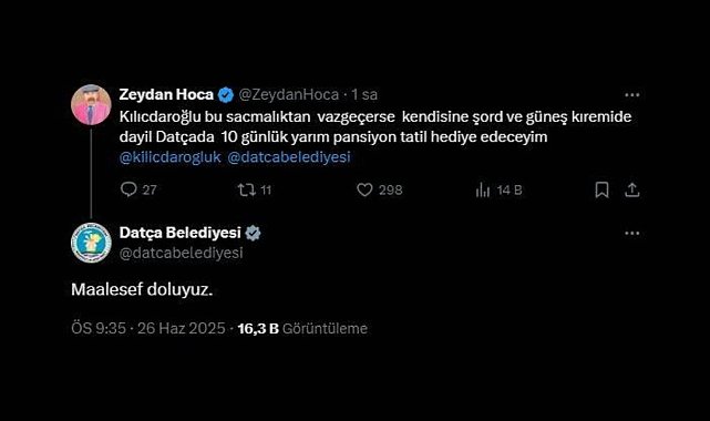 Geçtiğimiz günlerde bir sosyal medya kullanıcısının, Kemal Kılıçdaroğlu'na Datça'da 10 günlük tatil hediye edileceğini belirtmesi üzerine Datça Belediyesi'nin sosyal medya hesabından söz konusu paylaşımın altına "Maalesef doluyuz" yazılmıştı.