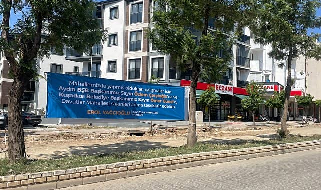 Davutlar Mahalle Muhtarı Erol Yağcıoğlu, Davutlar Mahallesi’nde yapılan çalışmalar dolayısıyla Aydın Büyükşehir Belediye Başkanı Özlem Çerçioğlu ve Kuşadası Belediye Başkanı Ömer Günel’e hazırladığı pankartla teşekkür etti.Kuşadası Davutlar Mahalle Muhtarı Erol Yağcıoğlu, Başkan Çerçioğlu ve Başkan Günel’e hazırladığı pankartla mahalle sakinleri adına teşekkür etti. Yağcıoğlu, şunları söyledi:“Gerek Büyükşehir Belediye Başkanımız Özlem Hanım gerekse de Kuşadası Belediye Başkanımız Ömer Bey, söz verdikleri yatırımları yerine getiriyor. Daha önce 25 sokak ile 4 caddede alt ve üstyapı çalışmaları tamamlanmıştı. Şimdi ana arterler de sıcak asfaltla kaplanan yollarımıza kavuştuk. Davutlar Mahallesi’nde her iki başkanımız sayesinde önemli bir değişim süreci başladı. Mahallemizde yaşayanlar adına başkanlarımıza teşekkür ediyorum. 30 yıldır çivi çakılmayan Davutlar Mahallesi’nde artık hizmet görmek bizleri mutlu ediyor.”