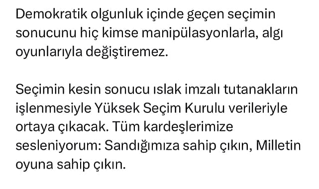 Gelecek Partisi Genel Başkanı Ahmet Davutoğlu, "Demokratik olgunluk içinde geçen seçimin sonucunu hiç kimse manipülasyonlarla, algı oyunlarıyla değiştiremez. Seçimin kesin sonucu ıslak imzalı tutanakların işlenmesiyle Yüksek Seçim Kurulu verileriyle ortaya çıkacak. Tüm kardeşlerimize sesleniyorum, sandığımıza sahip çıkın. Milletin oyuna sahip çıkın. Kazanacağız" dedi.