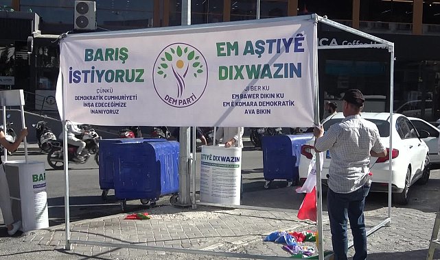 Haber: Abdurrahman AKÇAL(ADIYAMAN) - DEM Parti Genel Merkezi tarafından Türkiye genelinde başlattığı ‘barışa imza at’ kampanyası Adıyaman’da başladı.Halkların Eşitlik ve Demokrasi Partisi (DEM Parti), Türkiye Büyük Millet Meclisi’ne sunulmak üzere başlattığı “Barış İstiyoruz” imza kampanyası kapsamında Adıyaman’da da farklı noktalarda stantlar açtı. Adıyaman Üniversitesi KYK Yurdu önünde kurulan standı ziyaret eden DEM Parti Adıyaman İl Eş Başkanı Mehmet Bayır, vatandaşları ve öğrencileri imza vermeye davet etti.İmza kampanyasına ilişkin açıklamalarda bulunan Bayır, DEM Parti Genel Merkezinin aldığı kararla bölgede kampanya yürüteceklerini söylerken, "Biz de Adıyaman’da bugün bu çalışmaya start verdik. Üniversite önünde ve farklı noktalarda stantlarımızla halkımızla buluşuyoruz. Herkesi barışa imza atmaya davet ediyoruz” dedi.