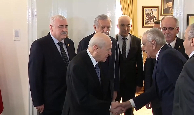 (TBMM) - DEM Partili Sırrı Süreyya Önder ve Pervin Buldan ile Ahmet Türk, MHP Genel Başkanı Devlet Bahçeli'yi TBMM'deki makamında ziyaret etti. Heyeti makamının kapısında karşılayan Bahçeli, tokalaştı ve içeri davet etti. Görüşme basına kapalı gerçekleştiriliyor.İmralı'da terör örgütü PKK lideri Abdullah Öcalan ile görüşen Sırrı Süreyya Önder ve Pervin Buldan ile heyete bugün dahil olan Ahmet Türk, siyasi parti turlarına başladı. Bugün saat 13.30'da TBMM Başkanı Numan Kurtulmuş'u makamında ziyaret eden Önder, Buldan ve Türk, saat 15.00'te de Devlet Bahçeli'ye TBMM'deki makamında ziyarette bulundu.Heyet gelirken makamının kapısına çıkan Bahçeli, onları kapıda bekledi ve tek tek tokalaşıp "Hoş geldiniz" diyerek, içeri davet etti. Basının yoğun ilgi gösterdiği ziyaret, basına kapalı gerçekleştiriliyor.