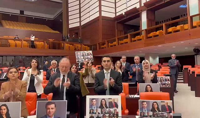(TBMM) - Adalet Bakanlığı'nın AİHM'in Selahattin Demirtaş kararına itiraz etmesine tepki gösteren DEM Parti milletvekilleri, Selahattin Demirtaş ve Figen Yüksekdağ başta olmak üzere siyasi tutukluların fotoğraflarının yer aldığı dövizler ve alkışlarla kararı protesto etti.TBMM Genel Kurulu bugün Meclis Başkanvekili Tekin Bingöl başkanlığında toplandı. Bingöl'ün Başkanlık Divanı ile Genel Kurul Salonu'na gelmesinin ardından DEM Parti grubu ayağa kalkarak alkış başlattı. AİHM'in Selahattin Demirtaş'ın serbest kalmasına yönelik kararına Adalet Bakanlığı'nın itiraz etmesine tepki gösteren DEM Partililer, Selahattin Demirtaş ve Figen Yüksekdağ başta olmak üzere siyasi tutukluların fotoğraflarının yer aldığı dövizler ve alkışlarla kararı protesto etti. Protestonun ardından Meclis Başkanvekili Bingöl, oturuma ara verdi.