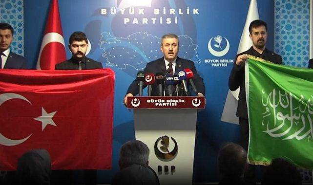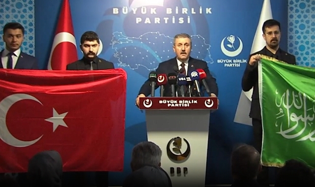 Büyük Birlik Partisi (BBP) Genel Başkanı Mustafa Destici, “Alperen gençlerimiz; bizim için vazgeçilmez olan iki bayrağı ellerinde tutuyorlar. Sağımdaki, ay yıldızlı al bayrağımız… Sol tarafımdaki gençlerimizin elinde tuttuğu da tevhid bayrağıdır… Bu hadiseden inşallah güzel bir ders çıkaracağız. İnşallah bir uyanışa vesile olacak. İnşallah Müslüman Türk gençliğinin tamamına, tevhidi de tevhid anlayışını da tevhid bayrağının ne olduğunu da öğreteceğiz… Biz ne ay yıldızlı al bayrağımızdan vazgeçeriz, ne de tevhid bayrağımızdan geçeriz” dedi.BBP Genel Başkanı Mustafa Destici, parti genel merkezinde bugün basın toplantısı düzenledi. Destici, şunları söyledi:“İki gündür İstanbul’da, 150 sivil toplum örgütünün Filistin’e, Gazze’ye destek, şehitlerimize saygı yürüyüşünden dönen ve elinde tevhid bayrağı olan bir vatandaşımıza yapılan yumruklu saldırı üzerinden bir algı operasyonu yürütülmeye çalışılıyor.Ve elinde tevhid bayrağı olduğu için saldırıya uğrayan kardeşimize geçmiş olsun diyor, saldırıyı da şiddetle lanetliyorum. Saldırının gerekçesinden bağımsız olarak; toplumu şiddetin övülmesine, şiddetin yöntem olarak benimsenmesine yönlendiren siyasetçileri ve basın mensupları da başta olmak üzere, herkesi kınıyorum.Şu anda bu gençlerimiz, Alperen gençlerimiz; bizim için vazgeçilmez olan iki bayrağı ellerinde tutuyorlar. Sağımdaki, ay yıldızlı al bayrağımız. Şehitlerimizin kanları sulanmış bu vatanın, bu devletin bağımsızlığını, bu milletin özgürlüğünü temsil ediyor. Kırmızını şehitlerimizin kanından alıyor. Ortasındaki hilal ve yıldız; hilal İslam’ı temsil ediyor. Asla vazgeçmeyeceğimiz, geçmişte nasıl şehitlerimiz kanlarını akıtarak ay yıldızlı al bayrağımız gönderden inmesin diye mücadele etmişse; bizler de aynı mücadeleyi vermeye hazırız. Bugün de şehitlerimiz; kahpe, hain, emperyalistlerin uşağı teröristlere karşı aynı mücadeleyi vermektedir.Sol tarafımdaki gençlerimizin elinde tuttuğu da tevhid bayrağıdır. Bu bayrak da bizim için vazgeçilmezdir ve inancımızı temsil etmektedir. Üzerinde ‘Kelime-i Tevhid’ yazmaktadır. Bunu başka anlamlara çekmeye çalışanlar, buna başka sıfatlar ya da isimler bulma gayreti içinde olanlar ya gafildir ya haindir ya da emperyalistlerin uşağıdır. Bunun başka bir yolu yok.Biz ‘La İlahe İllallah’ demeyeceğiz de ‘La İlahe İllallah, Muhammeden Resulullah’ demeyeceğiz de ne diyeceğiz? Demeyen birisi Müslüman olur mu? Ben o yumruklu saldırıyı yapan gencimizi değil, o gencimizi yetiştiren bu sisteme karşı çıkıyorum. O gencimiz, bu bayrağın anlamını bilmiyor, üzerindeki sözlerin anlamını bilmiyor. Çünkü okuyamıyor, bunu bilmiyor, yetiştirilmemiş; onu Suudi Arabistan bayrağı sanıyor. Bir Arap ülkesi bayrağı sanıyor. Maalesef, hem de en güzel üniversitelerden birisinde okumasına rağmen maalesef bunu bilmiyor. İşte bu büyük bir eksiklik. Bu bizim devletimizin eksikliği, eğitim sistemimizin eksikliğidir. Onun için o yumruğu atan gençten önce, biz işin buralarına bakmak zorundayız. Maalesef, gençlerimize değerlerimizi öğretememişiz. Maalesef milyonlarca gencimiz bu değerlerimizden bihaber olarak yetişmektedir.Bu hadiseden inşallah güzel bir ders çıkaracağız. İnşallah bir uyanışa vesile olacak. İnşallah Müslüman Türk gençliğinin tamamına, tevhidi de tevhid anlayışını da tevhid bayrağının ne olduğunu da öğreteceğiz.Bu hadisenin üzerinden bir kamplaşma meydana getiriliyor. Maalesef birtakım siyasetçilerimiz saldırıyı yapan gencin yalnız olmadığını söylüyor. Onu söyleyenlerin hepsi, eğer ufacık kendilerinde cesaret varsa, azıcık delikanlı iseler; o zaman onlar da aslında tevhid bayrağını tanımadıklarını, ona saygılarının olmadığını, onu sahiplenmediklerini söylemek istiyorlar. Çıksınlar bunu yürekli bir şekilde söylesinler. Lafı dolandırmaya gerek yok. Bir gencin üzerinden kendi siyasi emellerini dışa vurmalarına gerek yok. Yürekleri varsa, çıksınlar açıkça bunu ifade etsinler. Bu hadise üzerinden milleti ayrıştırmanın, milleti birbirine düşürmenin kendilerine bir yol olarak seçmesinler.“NİYE MİLLET BİRBİRİNE VURSUN?”Biz bunları tanıyoruz. Bir gazeteci, ki yıllarca bu ülkenin en önemli gazetecilerinden, televizyoncularından birisi olarak nam yapmış birisi ‘eline sağlık’ diyor. Bu ülkede kim kime vurursa, hiçbirisinin eline sağlık olmasın. Vurulacak olan bellidir; haindir, teröristtir. Onun dışında niye millet birbirine vursun? Niye birbirine vuranlara eline sağlık denilsin? Eğer birisi birisine vurduğunda, diğeri de ona ‘eline sağlık’ diyorsa; işte o devlete, millete, gençliğimize en büyük kötülüğü yapıyor demektir. Biz buradan açıkça ilan ediyoruz. Biz ne ay yıldızlı al bayrağımızdan vazgeçeriz, ne de tevhid bayrağımızdan geçeriz. Yani biz ‘tam bağımsız, hür, müstakil Türkiye Cumhuriyeti Devleti var olsun’ demeye de devam edeceğiz; ‘La İlahe İllallah Muhammeden Resulullah’ demeye de devam edeceğiz. Çünkü biz Türk’üz, Müslümanız, milliyetçiyiz, Alpereniz.”