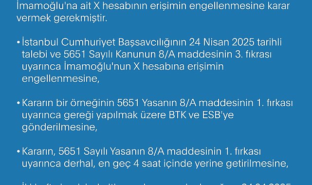 İstanbul Cumhuriyet Başsavcılığınca yürütülen başka bir soruşturma kapsamında tutuklu bulunan şüpheli Ekrem İmamoğlu'nun, X hesabından yapılan paylaşımları kendisinin yapmaması ve kamu düzenine zarar vermesi nedeniyle; tutukluluğunun sona ermesine kadar (tedbiren) X hesabının erişime engellenmesi için; 5651 sayılı İnternet Ortamında Yapılan Yayınların Düzenlenmesi ve Bu Yayınlar Yoluyla İşlenen Suçlarla Mücadele Edilmesi Hakkında Kanunun 8/2 delaletiyle aynı kanunun 8/A maddesi uyarınca karar verilmesi, kararın hem Bilgi Teknolojileri İletişim Kurumuna (BTK) hem de Erişim Sağlayıcıları Birliğine (ESB) gönderilmesi' talep edilmiştir.Talep, Sulh Ceza Hakimliğince incelendi Talep, İstanbul 8. Sulh Ceza Hakimliğince incelenmiş; yapılan incelemede, 'hesabın tamamına yönelik erişimin engellenmesi kararı verilmeden teknik olarak söz konusu ihlale ilişkin içeriğe erişimin engellenmesinin mümkün olamayacağı' gözetilerek, 5651 Sayılı Kanunun 8/A maddesinin 1. ve 3. fıkraları uyarınca şüpheli Ekrem İmamoğlu'na ait X hesabının erişimin engellenmesine karar vermek gerekmiştir.İstanbul Cumhuriyet Başsavcılığının 24 Nisan 2025 tarihli talebi ve 5651 Sayılı Kanunun 8/A maddesinin 3. fıkrası uyarınca, İmamoğlu'nun X hesabına erişimin engellenmesine, kararın bir örneğinin 5651 Yasanın 8/A maddesinin 1. fırkası uyarınca gereği yapılmak üzere BTK ve ESB'ye gönderilmesine, kararın, 5651 Sayılı Yasanın 8/A maddesinin 1. fırkası uyarınca derhal, en geç 4 saat içinde yerine getirilmesine, iki hafta içerisinde itiraz yolunun açık olacağına, 24.04.2025 tarihinde karar verilmiştir. X platformu, 24 Nisan 2025 tarihli yargı kararının ardından, Ekrem İmamoğlu'nun X hesabına erişim engeli getirmiştir."