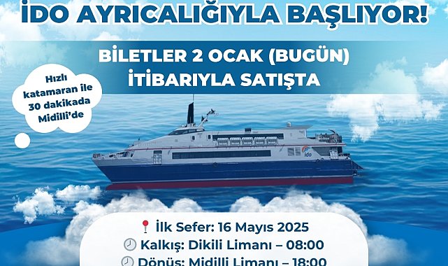 (İZMİR)- Dikili Belediye Başkanı Adil Kırgöz’ün girişimleri ve İstanbul Deniz Otobüsleri (İDO) iş birliğiyle Dikili-Midilli seferleri, 16 Mayıs 2025 Cuma günü başlıyor.Belediye Başkanı Adil Kırgöz’ün girişimleri ile Dikili-Midilli seferleri başlıyor. 16 Mayıs 2025 Cuma günü gerçekleşecek ilk seferde, saat 08.00’de Dikili Limanı’ndan hareket edecek deniz otobüsü, aynı gün saat 18.00’de Midilli Limanı’ndan dönüş yapacak. Hızlı katamaranlar sayesinde Dikili ile Midilli arasındaki ulaşım 30 dakika sürecek. Vatandaşlar, 2 Ocak 2025 tarihinden itibaren İDO internet adresinden bilet satın alabilecek ve sefer tarihleriyle ilgili detaylı bilgi edinebilecek. "Bölge halkına hem ekonomik hem de kültürel anlamda fayda sağlayacak"Dikili-Midilli seferlerinin başlamasından duyduğu mutluluğu dile getiren Belediye Başkanı Adil Kırgöz, "Yoğun çabalarımız sonucunda Dikili-Midilli seferlerini 16 Mayıs 2025’te başlatıyoruz. Yakın zamanda İstanbul Deniz Otobüsleri (İDO) yönetim kurulu ile birlikte Midilli Adası’nda Kuzey Ege Bölge Valisi ve Midilli Belediye Başkanı’nı ziyaret etmiştik. Karşılıklı iş birliği konusunda verimli görüşmeler gerçekleştirdik. Ege’nin iki yakasını birleştiren bu yeni ulaşım hizmeti, bölge halkına hem ekonomik hem de kültürel anlamda fayda sağlayacak. Ege’nin iki yakası için de hayırlı olsun" dedi.