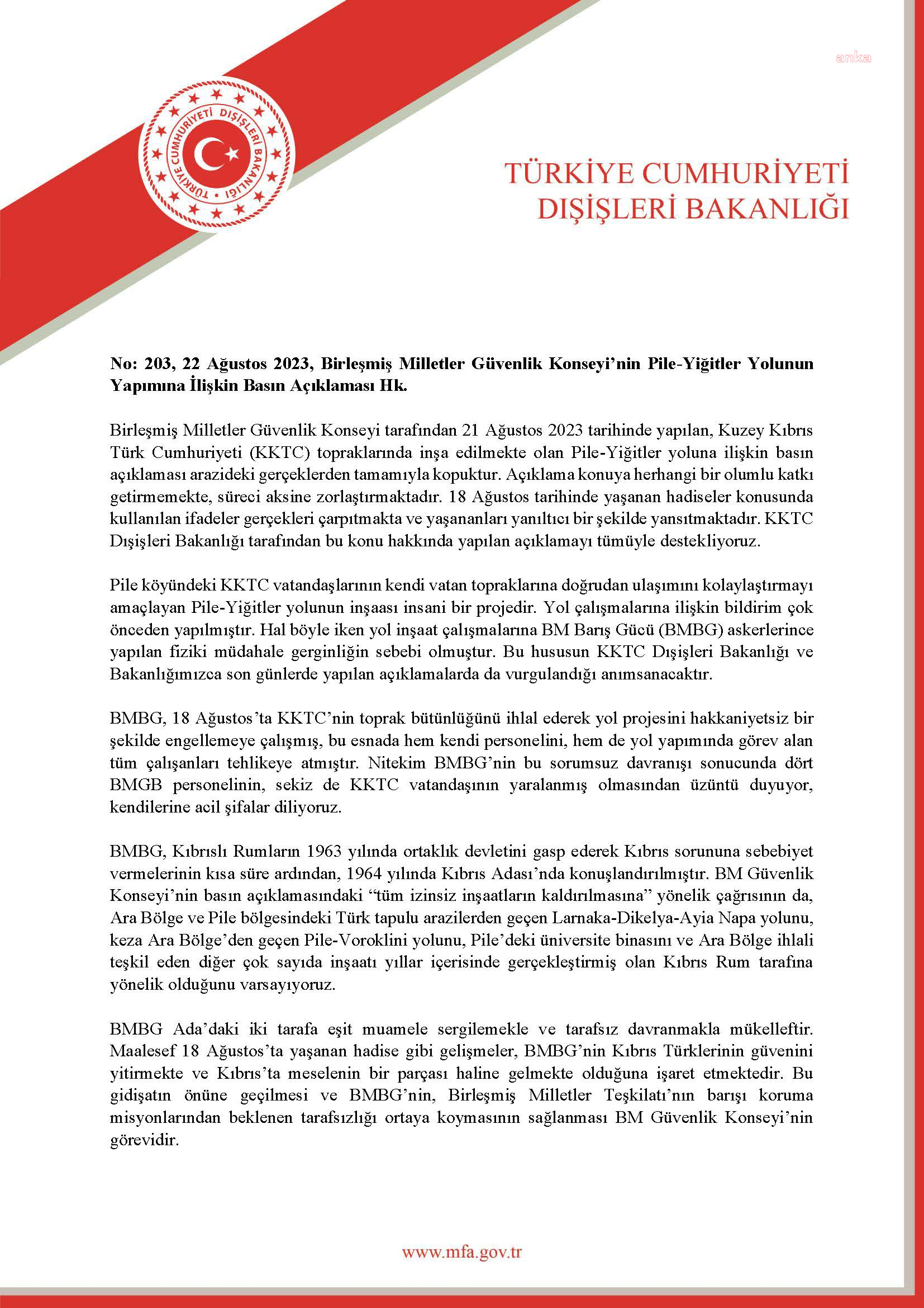 Dışişleri Bakanlığı, “Birleşmiş Milletler Güvenlik Konseyi tarafından 21 Ağustos 2023 tarihinde yapılan, Kuzey Kıbrıs Türk Cumhuriyeti (KKTC) topraklarında inşa edilmekte olan Pile-Yiğitler yoluna ilişkin basın açıklaması arazideki gerçeklerden tamamıyla kopuktur. Açıklama konuya herhangi bir olumlu katkı getirmemekte, süreci aksine zorlaştırmaktadır. 18 Ağustos tarihinde yaşanan hadiseler konusunda kullanılan ifadeler gerçekleri çarpıtmakta ve yaşananları yanıltıcı bir şekilde yansıtmaktadır. KKTC Dışişleri Bakanlığı tarafından bu konu hakkında yapılan açıklamayı tümüyle destekliyoruz” açıklamasını yaptı.Dışişleri Bakanlığı, Birleşmiş Milletler Güvenlik Konseyi’nin KKTC topraklarında inşa edilmekte olan Pile-Yiğitler Yolu Projesi’ne ilişkin açıklamasına tepki gösterdi. Bakanlık’tan yapılan yazılı açıklamada şu ifadelere yer verildi:“KULLANILAN İFADELER GERÇEKLERİ ÇARPITMAKTA VE YAŞANANLARI YANILTICI BİR ŞEKİLDE YANSITMAKTADIR”“Birleşmiş Milletler Güvenlik Konseyi tarafından 21 Ağustos 2023 tarihinde yapılan, Kuzey Kıbrıs Türk Cumhuriyeti (KKTC) topraklarında inşa edilmekte olan Pile-Yiğitler yoluna ilişkin basın açıklaması arazideki gerçeklerden tamamıyla kopuktur. Açıklama konuya herhangi bir olumlu katkı getirmemekte, süreci aksine zorlaştırmaktadır. 18 Ağustos tarihinde yaşanan hadiseler konusunda kullanılan ifadeler gerçekleri çarpıtmakta ve yaşananları yanıltıcı bir şekilde yansıtmaktadır. KKTC Dışişleri Bakanlığı tarafından bu konu hakkında yapılan açıklamayı tümüyle destekliyoruz.Pile köyündeki KKTC vatandaşlarının kendi vatan topraklarına doğrudan ulaşımını kolaylaştırmayı amaçlayan Pile-Yiğitler yolunun inşası insani bir projedir. Yol çalışmalarına ilişkin bildirim çok önceden yapılmıştır. Hal böyle iken yol inşaat çalışmalarına BM Barış Gücü (BMBG) askerlerince yapılan fiziki müdahale gerginliğin sebebi olmuştur. Bu hususun KKTC Dışişleri Bakanlığı ve Bakanlığımızca son günlerde yapılan açıklamalarda da vurgulandığı anımsanacaktır.BMBG, 18 Ağustos’ta KKTC’nin toprak bütünlüğünü ihlal ederek yol projesini hakkaniyetsiz bir şekilde engellemeye çalışmış, bu esnada hem kendi personelini hem de yol yapımında görev alan tüm çalışanları tehlikeye atmıştır. Nitekim BMBG’nin bu sorumsuz davranışı sonucunda dört BMGB personelinin, sekiz de KKTC vatandaşının yaralanmış olmasından üzüntü duyuyor, kendilerine acil şifalar diliyoruz.“BMBG ADA’DAKİ İKİ TARAFA EŞİT MUAMELE SERGİLEMEKLE VE TARAFSIZ DAVRANMAKLA MÜKELLEFTİR”BMBG, Kıbrıslı Rumların 1963 yılında ortaklık devletini gasp ederek Kıbrıs sorununa sebebiyet vermelerinin kısa süre ardından, 1964 yılında Kıbrıs Adası’nda konuşlandırılmıştır. BM Güvenlik Konseyi’nin basın açıklamasındaki ‘tüm izinsiz inşaatların kaldırılmasına’ yönelik çağrısının da Ara Bölge ve Pile bölgesindeki Türk tapulu arazilerden geçen Larnaka-Dikelya-Ayia Napa yolunu, keza Ara Bölge’den geçen Pile-Voroklini yolunu, Pile’deki üniversite binasını ve Ara Bölge ihlali teşkil eden diğer çok sayıda inşaatı yıllar içerisinde gerçekleştirmiş olan Kıbrıs Rum tarafına yönelik olduğunu varsayıyoruz.BMBG Ada’daki iki tarafa eşit muamele sergilemekle ve tarafsız davranmakla mükelleftir. Maalesef 18 Ağustos’ta yaşanan hadise gibi gelişmeler, BMBG’nin Kıbrıs Türklerinin güvenini yitirmekte ve Kıbrıs’ta meselenin bir parçası haline gelmekte olduğuna işaret etmektedir. Bu gidişatın önüne geçilmesi ve BMBG’nin, Birleşmiş Milletler Teşkilatı’nın barışı koruma misyonlarından beklenen tarafsızlığı ortaya koymasının sağlanması BM Güvenlik Konseyi’nin görevidir.”