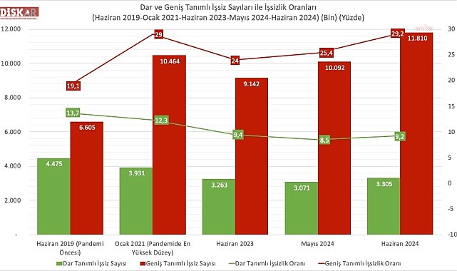 (ANKARA) - TÜİK'in haziran ayı işsizlik verilerini açıklamasının ardından DİSK Araştırma Merkezi (DİSK-AR) rapor yayımladı. DİSK-AR'ın hazırladığı raporda, geniş tanımlı işsiz sayısının pandemi döneminden daha fazla olduğu vurgulanarak, son bir ayda 1 milyon 718 bin artarak, 11 milyon 810 bin olduğu belirtildi. İSK-AR, işgücü istatistiklerinin yayımlanmasının ardından dar ve geniş tanımlı işsizlik oranlarını içeren bir rapor paylaştı. DİSK'in raporunda, "Geniş tanımlı işsizlik zivrede, yüzde 29,2 ve 11 milyon 810 bin" denildi. DİSK-AR, geniş tanımlı işsiz sayısının son bir yılda 2,7 milyon, son bir ayda ise 1,7 milyon kişi arttığını belirtti.DİSK-AR'ın raporunda, şu ifadelere yer verildi:"DİSK-AR tarafından TÜİK verilerinden yararlanarak yapılan hesaplamaya göre mevsim etkisinden arındırılmış geniş tanımlı işsiz sayısı ise Haziran 2024’te 11 milyon 810 bin kişi olarak gerçekleşti. TÜİK’e göre pandemi öncesinde, 2019 Haziran’da yüzde 13,7 olan dar tanımlı işsizlik Haziran 2024’te yüzde 9,2 olarak gerçekleşti. Ancak aynı dönemde geniş tanımlı işsizlik oranı ise yüzde 19,1’den yüzde 29,2’ye yükseldi. Son 1 yılda geniş tanımlı işsiz sayısı 2 milyon 668 bin artarak 9,1 milyondan 11,8 milyona yükseldi. Covid-19 salgını sonrası geniş tanımlı işsizlik oranı 10 puan, geniş tanımlı işsiz sayısı ise 5 milyon 205 bin kişi arttı."Geniş tanımlı kadın işsizliği yüzde 37'ye yükseldiDİSK-AR'ın raporunda kadın işsizliğinin erkek işsizliğinden daha fazla olduğuna vurgu yapıldı. TÜİK raporunda Haziran 2024’te mevsim etkisinden arındırılmış dar tanımlı işsizlik oranı erkeklerde yüzde 7,6 iken kadınlarda yüzde 12,4 olarak görüldü.Resmi işsizlerin yaklaşık yüzde 88'i işsizlik ödeneği alamıyorRaporda, işsizlik ödeneğinden yararlanma koşullarının ağır olması nedeniyle işsizlerin büyük çoğunluğunun yardımlardan faydalanamadığı belirtildi. DİSK-AR, şöyle açıkladı:"Haziran 2024’te TÜİK toplam dar tanımlı işsiz sayısını 3 milyon 305 bin kişi olarak açıkladı. İŞKUR’un Haziran 2024 İşsizlik Sigortası Bültenleri verilerine göre ise bu ayda işsizlik ödeneği alabilenlerin sayısı 377 bin civarındadır. Böylece Haziran 2024’te resmi işsizlerin sadece yüzde 11,4’ü işsizlik ödeneği alabildi. Yaklaşık 3 milyon işsiz işsizlik ödeneğinden yoksun kaldı. Bu da işsizlerin yüzde 88,6’sının işsizlik ödeneği alamadığı anlamına geliyor."Geniş ve dar tanımlı işsizlik farkı 20 puanDİSK-AR'ın raporunda geniş ve dar tanımlı işsizlik oranı arasındaki farkın açıldığına değinildi. Raporda, "Dar ve geniş işsizlik arasındaki makasın bu denli açılmasının en önemli nedeni zamana bağlı eksik istihdam sayısı, ümidini kaybedenlerin, iş aramayıp çalışmaya hazır olanların ve iş arayıp işbaşı yapamayacak olanların sayısındaki artıştır. Böylece dar tanımlı işsizlik sınırlı kalırken geniş tanımlı işsizlik arasındaki fark açılmaktadır'' tespiti yapıldı.