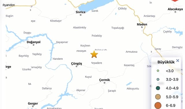 Diyarbakır’ın Çüngüş ilçesinde saat 01.25’te, 7 kilometre derinlikte, 4.2 büyüklüğünde deprem oldu.AFAD; Diyarbakır’ın Çüngüş ilçesinde bugün saat 01.25’te, 7 kilometre derinlikte, 4.2 büyüklüğünde deprem olduğunu açıkladı. Kandilli Rasathanesi ise depremin 5 kilometre derinlikte, 4.2 büyüklüğünde olduğunu bildirdi.