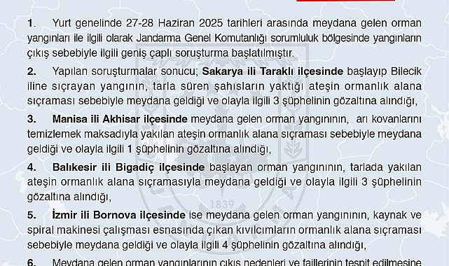 (ANKARA) - Jandarma Genel Komutanlığı Sakarya, Manisa, İzmir ve Balıkesir'deki orman yangınlarına ilişkin 11 kişinin gözaltına alındığını duyurdu.Jandarma Genel Komutanlığından yapılan yazılı açıklamada, yurt genelinde 27-28 Haziran'da meydana gelen orman yangınlarıyla ilgili jandarmanın sorumluluk bölgesinde geniş çaplı soruşturma başlatıldığı belirtildi.Açıklamada Sakarya'nın Taraklı ilçesinde başlayıp Bilecik'e sıçrayan yangının, tarla süren şahısların yaktığı ateşin ormanlık alana sıçraması sebebiyle meydana geldiği ve olayla ilgili 3 şüphelinin gözaltına alındığı bildirildi.Manisa'nın Akhisar ilçesinde meydana gelen orman yangınının, arı kovanlarını temizlemek maksadıyla yakılan ateşin ormanlık alana sıçraması sebebiyle meydana geldiği ve olayla ilgili 1 şüphelinin gözaltına alındığı, Balıkesir'ın Bigadiç ilçesinde başlayan orman yangınının ise tarlada yakılan ateşin ormanlık alana sıçramasıyla çıktığı aktarılan açıklamada, bu yangına ilişkin 3 şüphelinin gözaltına alındığı kaydedildi.Açıklamada, İzmir'in Bornova ilçesindeki orman yangınının da kaynak ve spiral makinesi çalışması esnasında çıkan kıvılcımların ormanlık alana sıçraması sebebiyle meydana geldiği ve olayla ilgili 4 şüphelinin gözaltına alındığı ifade edildi.