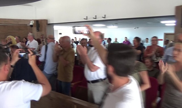 (EDİRNE) - Edirne Belediye Meclisinin haziran toplantısında bir cemaate tahsis edilen yurt yerinin görüşüldüğü maddenin oy birliği ile kabul edilmesi, meclisi izleyen demokratik kitle örgütü temsilcileri tarafından alkışlarla protesto edildi.