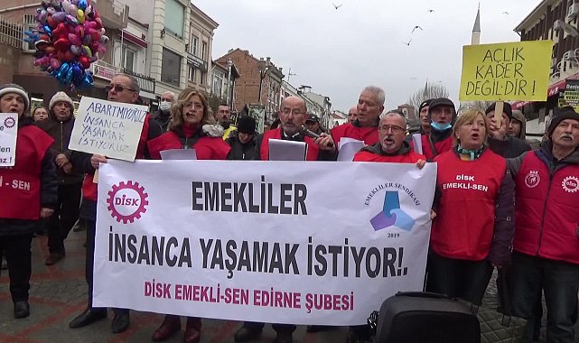 Edirne’de emekliler, Saraçlar Caddesi’nde emekli maaşlarına yapılan zamları protesto etti. DİSK Emekli Sen Edirne Şubesi Mali Sekreteri Ekrem Kaya, "Bir yandan açlık ve yoksulluk sınırının altındaki rakamlarla geçinmemizi tavsiye ederken, diğer yandan bizlere ekonomi dersi vermekten vazgeçmiyorlar. Bizlere ekonomi dersi vermek istiyorsanız, her ay gerçek enflasyon oranına göre maaş artışı yaparak insanca yaşamamıza olanak tanıyınız" dedi.