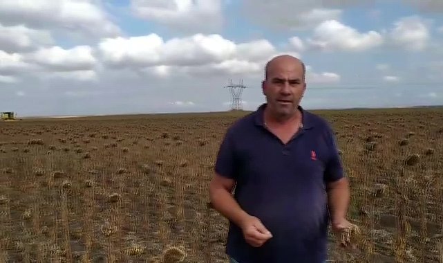“Ayçiçek hasadı başlamış durumda. ‘Görünen köy klavuz istemez’ dedikleri olay. Çiftçi emeğini 4 ay önce toprağa dikti. Gördüğünüz üzere kafaların durumu. Yaklaşık 3 aydan beri köylere yağmur düşmedi. Geçen yıl Trakya Birlik 40 yağ oranına ‘18 lira 80 kuruş’ dedi. Bu sene Trakya Birlik’ten çiftçiler olarak haber bekliyoruz. 40 yağ oranı kaç olacak? İnşallah 40 yağ 30 lira olur da çiftçi bir kez olsun kazanır. Bugün hasadımız var. Ortalama verim buralarda dekara 40 ila 60 kilogram. Ama bu tarla dekara 20 kilogram yapar mı?”