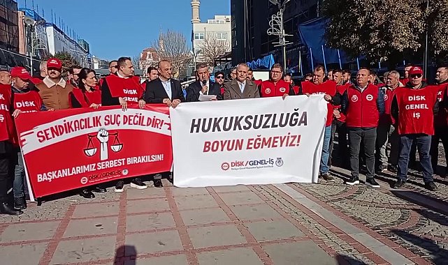 (EDİRNE) - DİSK üyeleri, Edirne’de Genel İş Sendikası Başkanı Remzi Çalışkan ile Genel-İş Mersin Şube Başkanı Kemal Göksoy’un tutuklanmasına yaptıkları açıklamayla tepki gösterdi. Genel İş Mali İşler Daire Başkanı Yaşar Gündoğdu, “Somut delillere dayanmayan, uydurma gizli tanık ifadeleriyle tutuklanmaları siyasi bir operasyon olup, emeğe ve demokrasiye dönük büyük bir saldırıdır” dedi.
