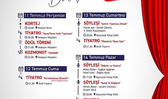 (İZMİR)- Efes Selçuk Belediyesi, 17. Uluslararası Türkiye Tiyatro Buluşması'na ev sahipliği yapacak. İzmir Büyükşehir Belediyesi ve Efes Selçuk Belediyesi desteği ile 11-14 Temmuz günleri arasında düzenlenecek buluşma, tiyatro üreticilerini ve tiyatro severleri İlham Veren Kent Efes Selçuk’ta bir araya getirecek.Efes Selçuk Belediye Başkanı Filiz Ceritoğlu Sengel, “Efes Selçuk'un tarihi ve kültürel dokusuyla bütünleşen bu buluşmada, tiyatro severlerle bir araya gelerek tiyatronun büyülü dünyasında unutulmaz anlar paylaşmak için heyecanlıyız” dedi.Tiyatroseverler, dört gün sürecek etkinlikte çeşitli atölye çalışmaları, performanslar ve panellere katılarak tiyatro dünyasının dinamikleri hakkında bilgi sahibi olabilecek. Düzenlenecek ödül törenindeise bu yıl 14 sanatçıya ödül verilecek.Buluşma, 11 Temmuz Perşembe günü saat 20.00’de Atatürk Anıtı önünde kortej ile başlayacak. İlk gün kortejin ardından İzmir Halk Tiyatrosu tarafından İstasyon Meydanı’nda “İsyan” adlı oyun sahnelenecek.Söyleşiler ve oyunlar düzenlenecek 17. Uluslararası Türkiye Tiyatro Buluşması süresince “Karaiskakena Efsanesi” (12 Temmuz), “Woyzeck” (13 Temmuz), “Güne Bakan Cam Kırıkları Mecburi İstikamet” (14 Temmuz) oyunlar, seyirci ile buluşacak.Buluşma kapsamında düzenlenecek söyleşilerde Haluk Işık, Semih Çelenk, Emre Küçükaydın, Metin Güler, Çağlar İşgören, Nazif Uslu, Özgün Aytar, Orhan Aydın, Levent Üzümcü, Gizem Yerik tiyatro severlerle bir araya gelecek.Tiyatro Buluşması ile ilgili ayrıntılı bilgiye vatandaşlar, Belediye'nin sosyal medya hesaplarından ulaşabilecek.