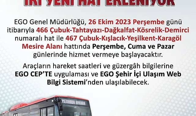Ankara Büyükşehir Belediyesi Başkent’te ulaşımın daha konforlu ve güvenli olması için çalışmalarını sürdürürken bir yandan da vatandaşlardan gelen talepleri geri çevirmiyor. EGO Genel Müdürlüğü Çubuk ilçesine bağlı mahalleler için harekete geçti. Bu kapsamda 26 Ekim Perşembe günü itibariyle Perşembe, Cuma ve Pazar günleri saat 06.20- 17.30 saatleri arasında 466 ve 467 numaralı iki otobüs hattı hizmete başlayacak.Başkent’te ulaşımın daha güvenli ve konforlu olması için çalışmalarını sürdüren Ankara Büyükşehir Belediyesi çevre ilçelerde de ulaşımın erişilebilir ve kesintisiz olması adına yeni otobüs hatlarını devreye sokuyor.VATANDAŞLARDA GELEN TALEP GERİ ÇEVRİLMEDİVatandaşlardan gelen talepleri geri çevirmeyen EGO Genel Müdürlüğü, bu kez de Çubuk ilçesine bağlı mahalleler için harekete geçti. Bu kapsamda 26 Ekim Perşembe günü itibariyle Perşembe, Cuma ve Pazar günlerinde 06.20-17.30 saatleri arasında hizmete girecek, ulaşım ağına katkıda bulunacak iki yeni otobüs hattı bilgileri şöyle:-466 numaralı hat: Çubuk- Tahtayazı- Dağkalfat-Kösrelik-Demirci- 467 numaralı hat: Çubuk- Kışlacık-Yeşilkent-Karagöl Mesire Alanı