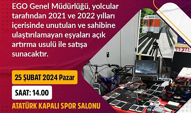 EGO Genel Müdürlüğü, yolcular tarafından 2021-2022 yılları içerisinde otobüs, ANKARAY ve Metro İstasyonları’nda unutulan eşyaları, 25 Şubat Pazar günü açık artırma usulü ile satışa çıkaracak. Atatürk Kapalı Spor Salonu'nda düzenlenecek açık artırma, saat 14.00'te başlayacak.EGO Genel Müdürlüğü, toplu taşıma araçlarında unutulan eşyaları, 25 Şubat 2024 Pazar günü saat 14'te açık artırma yöntemiyle satışa çıkaracak.2021-2022 yılları içerisinde EGO otobüsleri ile ANKARAY ve Metro İstasyonları’nda bulunan ve sahibi çıkmayan kayıp eşyalar, Atatürk Kapalı Spor Salonu'nda herkese açık olarak satışa sunulacak.Yasal sürenin tamamlanmasının ardından sahibine ulaşılamayan elektronik eşyalardan giysiye kadar binlerce eşyanın satışa sunulacağı açık artırma ABB TV, Youtube Kanalı ve Büyükşehir Belediyesi sosyal medya hesapları üzerinden canlı olarak yayınlanacak.