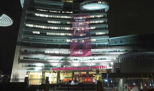 Haber: İleyda ÖZMEN / Kamera: Tunahan GÜLER(ANKARA) - İstanbul Büyükşehir Belediye (İBB) ve Türkiye Belediyeler Birliği (TBB) Başkanı Ekrem İmamoğlu'nun gözaltına alınmasının ardından CHP Genel Merkezi'ne "Kurtuluş yok tek başına ya hep beraber ya hiç birimiz. Darbeye teslim olmayız" pankartı asıldı.İBB ve TBB Başkanı Ekrem İmamoğlu'nun gözaltına alınmasının ardından CHP Genel Merkezi'nin binasına CHP Genel Başkanı Özgür Özel ve İmamoğlu'nun fotoğrafının yer aldığı ve "Kurtuluş yok tek başına ya hep beraber ya hiç birimiz. Darbeye teslim olmayız" yazılı pankartı asıldı.