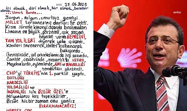 (İSTANBUL) - Silivri'deki Marmara Cezaevi'nde tutuklu bulunan CHP'nin cumhurbaşkanı adayı Ekrem İmamoğlu, CHP'de kurultay davası tartışmalarına ilişkin CHP Genel Başkanı Özgür Özel'e destek mesajı paylaştı. İmamoğlu, mesajında önceki dönem genel başkanları ve tüm partililerin birlik ve beraberlik içerisinde olması gerektiğini vurguladı.Ekrem İmamoğlu Cumhurbaşkanlığı Aday Ofisi resmi hesabından yapılan paylaşımda, "Partimize, birlik ve beraberliğimize, demokrasimize yapılan planlı saldırıları reddediyoruz. Partimizin ve genel başkanımızın bu süreçte yanındayız. Önceki dönem genel başkanlarımızı ve tüm partililerimizi bir ve beraber olmaya davet ediyorum." ifadeleri yer aldı.Paylaşımda İmamoğlu'nun yazdığı not da paylaşıldı. Notda şu ifadeler yer alıyor:"İri olmak, diri olmak, bir olmak, beraber olmak. Umut burada... Yorgun, solgun, umutsuz gemiyi millet tersanesine dostları ile çekti. Kısa sürede kimseyi dışarda bırakmadan limanın en büyük, görkemli, ışık saçan, heyecan veren germisini, 'tam yol ileri' diyerek yola çıkardı.Kimileri imrenerek kimileri kıskanarak bakıyordu. Gemisini de yol arkadaşlarını da hep savundu. Camide, cezaevinde mezarlıkta vefayı! Meydanlarda eylemlerde, azmi ve kararlılığı tereddütsüz gösterdi.CHP'yi Türkiye'nin 1. partisi yaptı. Dostluğu, kardeşliği, yoldaşlığı ve insanlığı için Özgür Özel'e milyonlarca kez teşekkürler. Biz de hiçbir zaman onu yanlız bırakmayacağız! Her şey çok güzel olacak! Ekrem İmamoğlu."